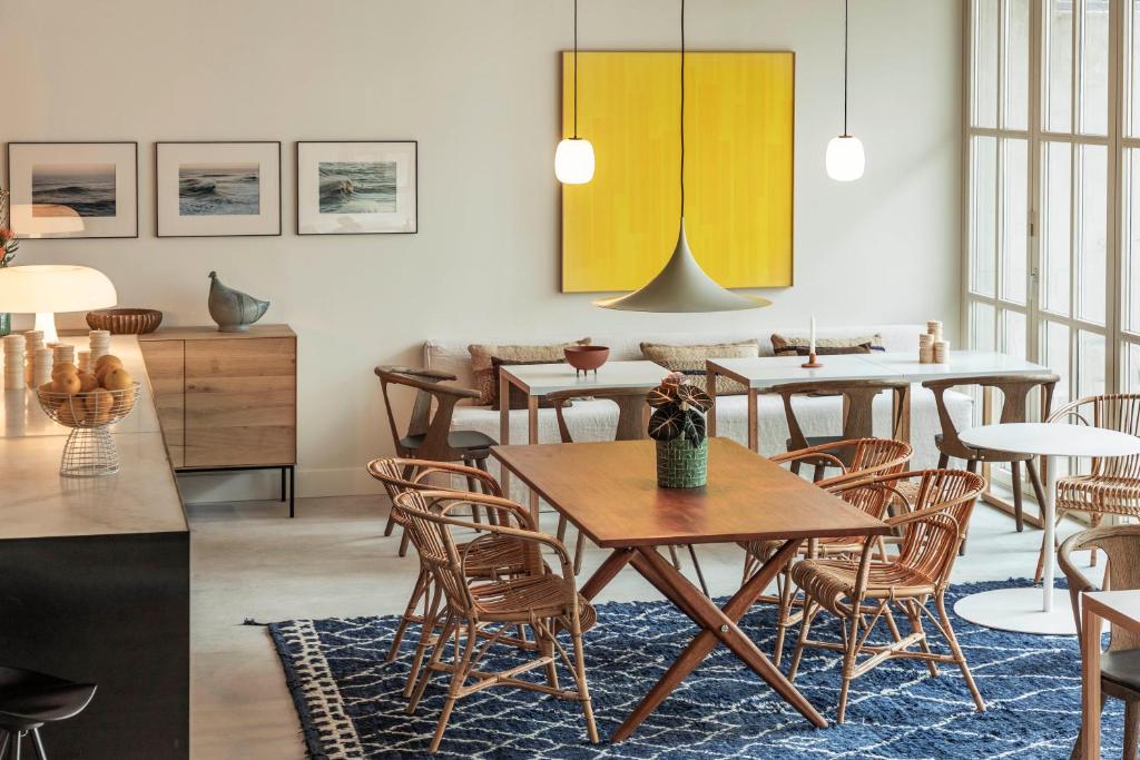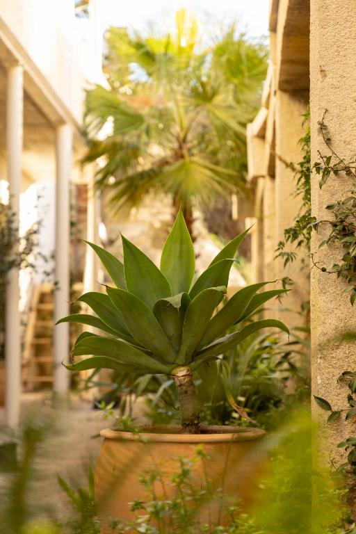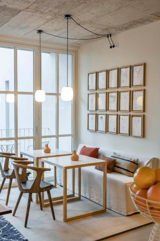 The heart of the hotel is its namesake patio: a sun-drenched courtyard planted with citrus trees and scented herbs. Here, breakfast unfolds slowly on handmade crockery, and guests drift back throughout the day to read, sip coffee, or simply let the rhythm of the neighborhood wash over them. It’s not just a pretty space—it’s the soul of the hotel, designed to invite pause.