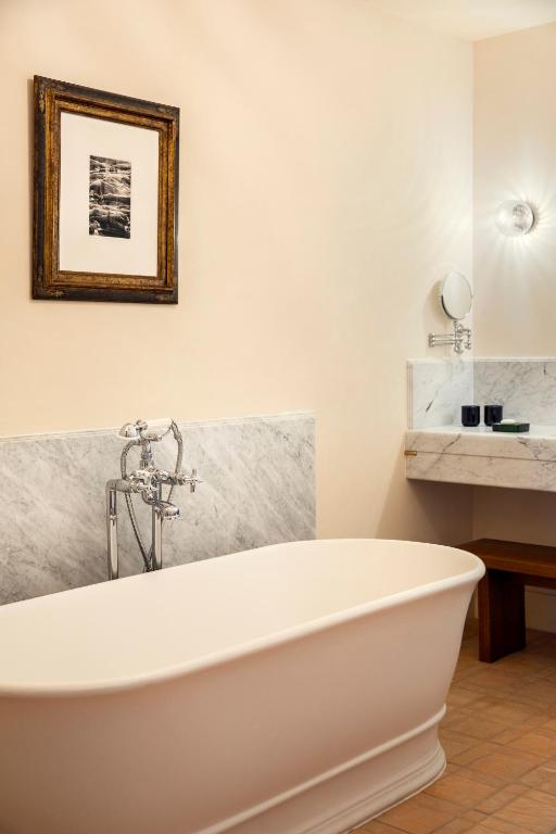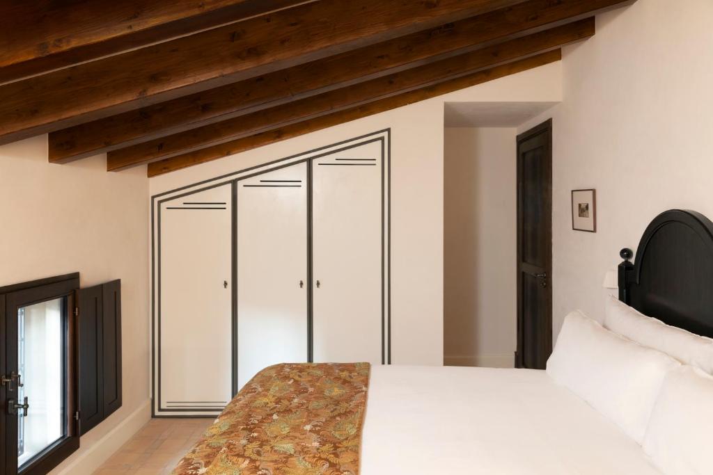 Design here is layered and expressive. In the salon, you’ll find an electric blue sofa, antique Moroccan chairs, and an original Joan Miró lithograph—a bold but balanced composition of old and new. Outside, a traditional Mallorcan courtyard, rooftop terrace, and wellness area (carved into the palace’s former pottery ovens) create a rhythm of relaxation and discovery.