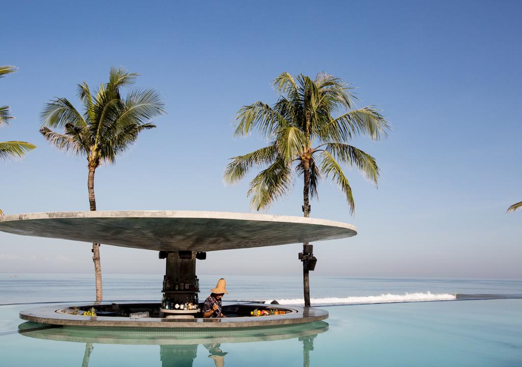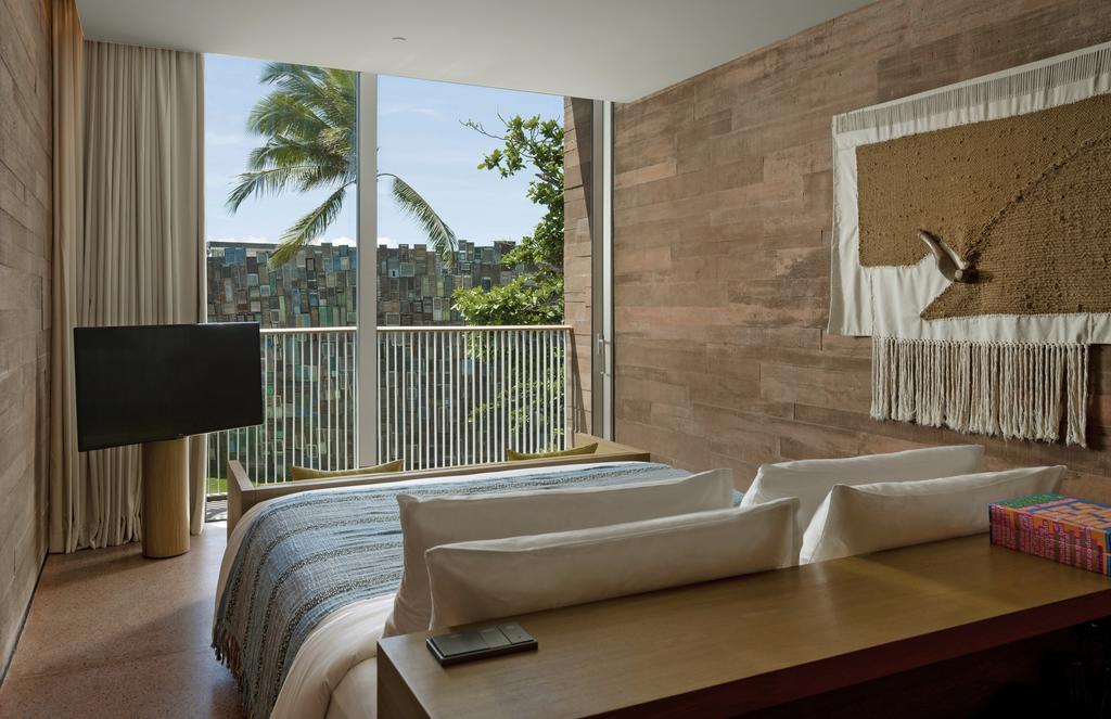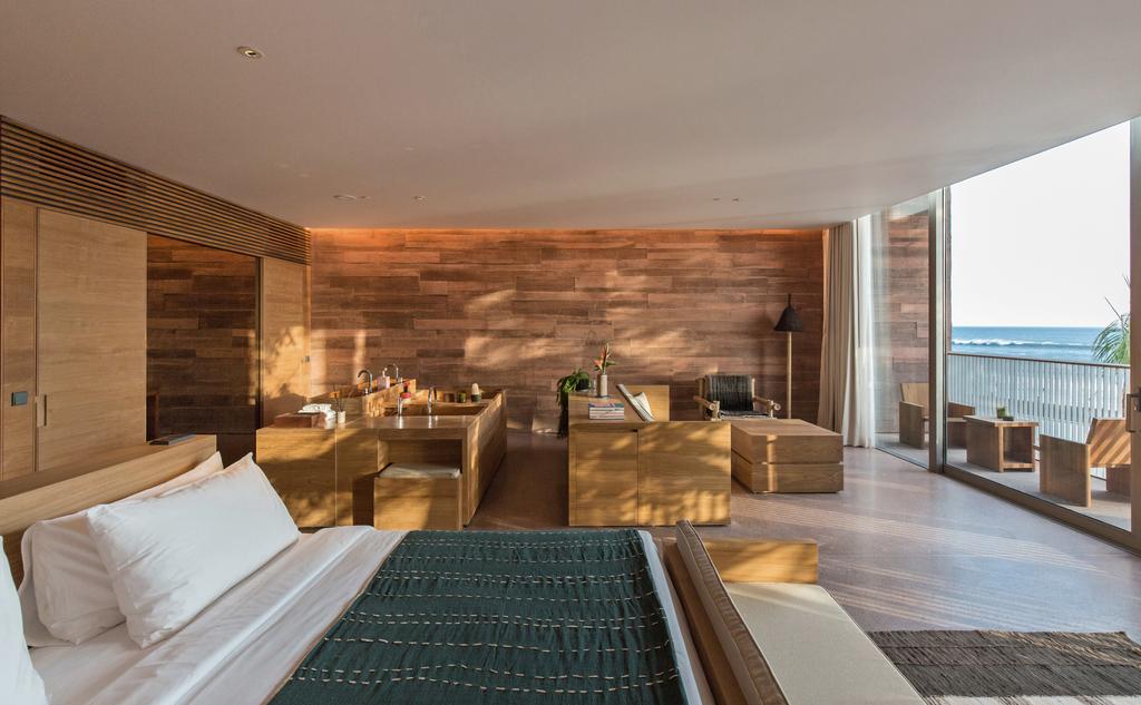 Rising on sculptural stilts, the Studios form a monumental courtyard complex that opens itself to the ocean and the city alike. Its geometry is pure OMA—sharp, audacious, and unforgettable—but the spirit is unmistakably Indonesian. Ceilings are woven from recycled bottles, walls are cast in concrete etched with Balinese lunar symbols, and spaces breathe with an earthy rhythm of light, shadow, and texture. The design honors heritage while propelling it forward, a powerful statement that sustainability can be as tactile as it is visionary. Below, the heartbeat of the property pulses in unexpected places: a subterranean nightclub, a recording studio, and performance spaces designed for art, sound, and movement. Above, 168 rooms reflect the same philosophy—every detail intentional, every material meaningful.