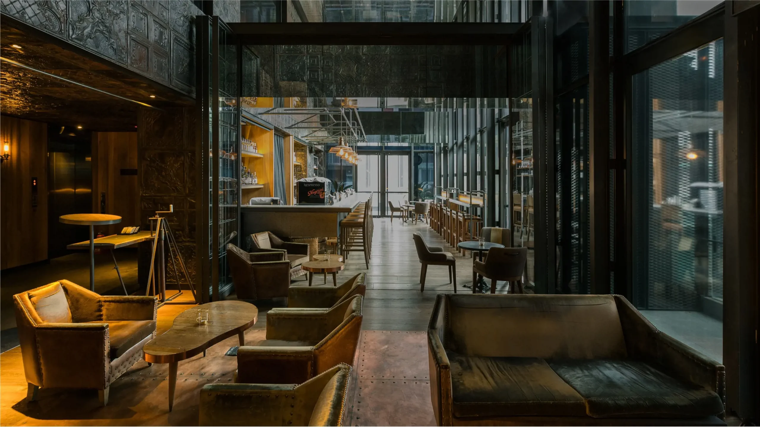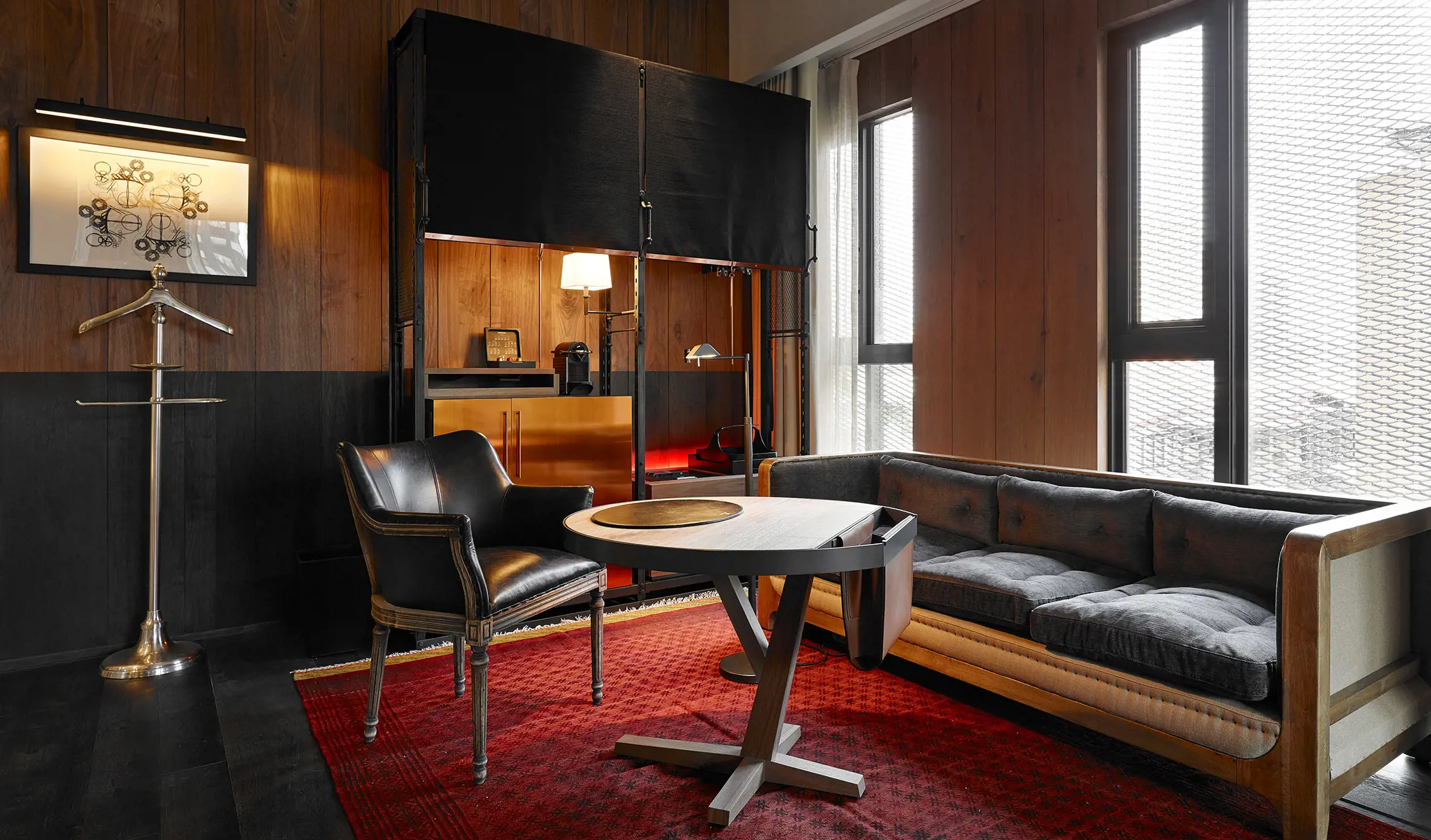 Each of the 42 rooms reflects Chen’s theatrical design approach. Materials speak in contrasts—cool marble and dark steel offset by warm wood paneling and supple leather. Lighting becomes part of the architecture, with concealed fixtures and dramatic shadows turning each space into a cinematic set piece. Floor-to-ceiling windows frame the city beyond, while inside, crystal details and mirrored surfaces amplify light into unexpected corners. Bathrooms, clad in black stone and copper, feel like intimate stage sets, balancing privacy with indulgent spectacle.
