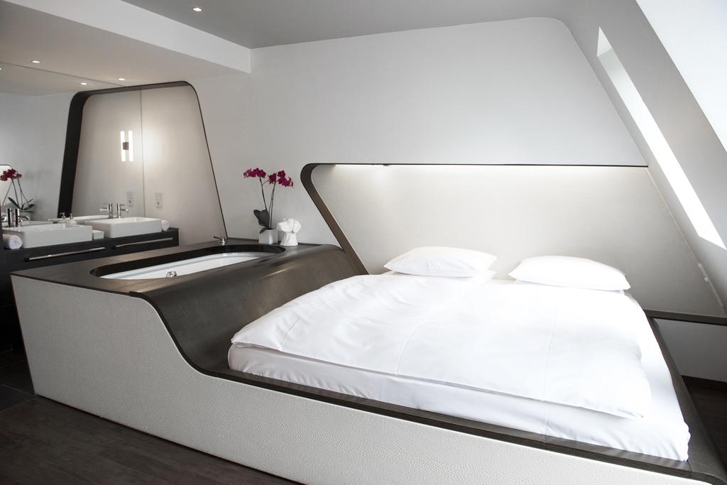 Inside the guestrooms, form follows fantasy. Beds curve directly into bathtubs, walls melt into ceilings, and materials like white lacquer and dark wood create a sleek, almost futuristic atmosphere. Whether you’re here for romance, escape, or just a different kind of stay, Q! delivers an immersive, unconventional experience that’s all about tactile pleasure and visual intrigue.