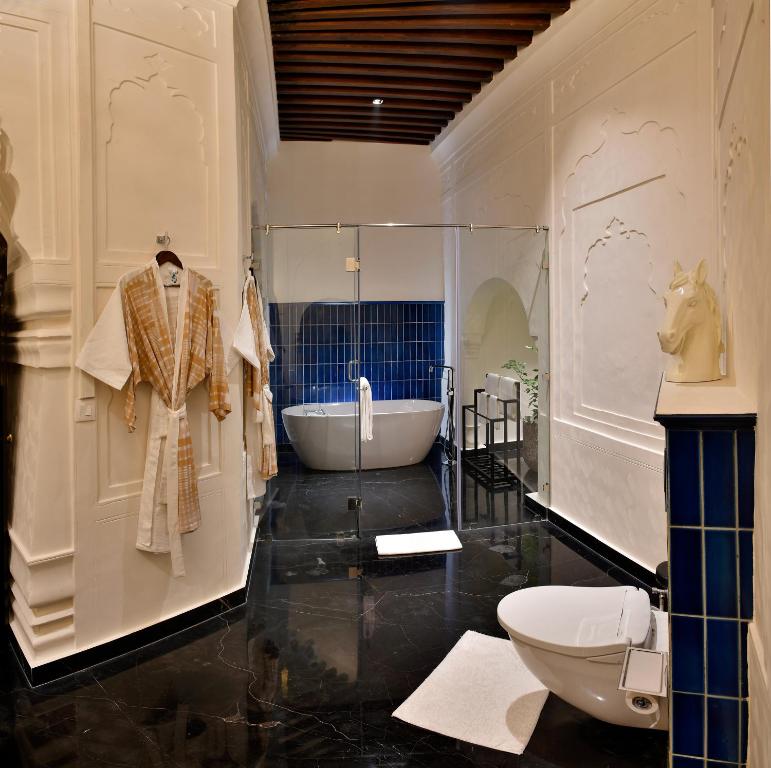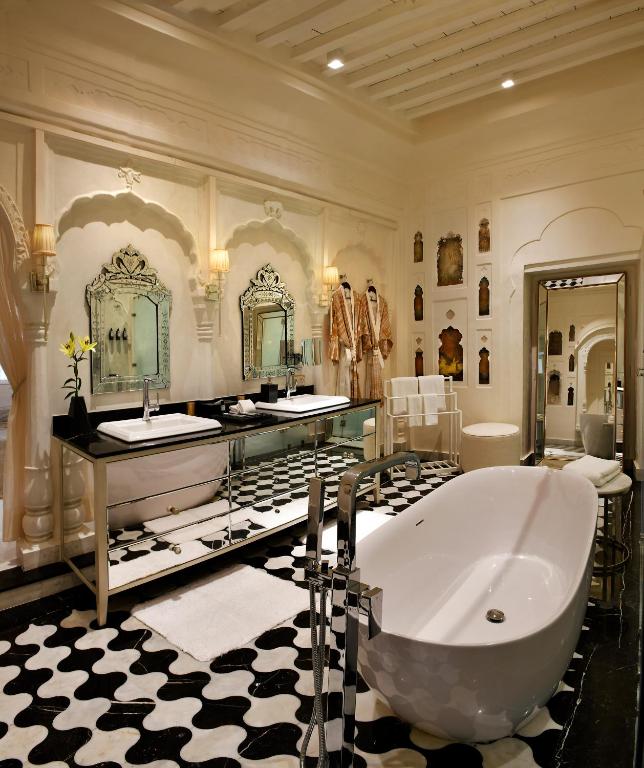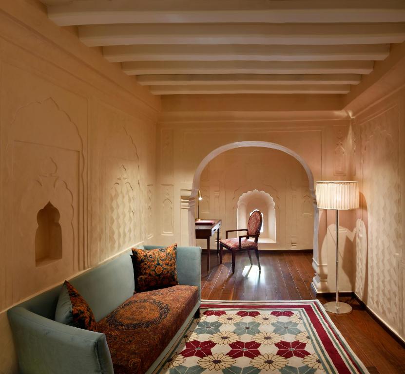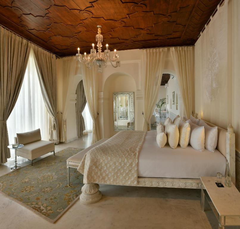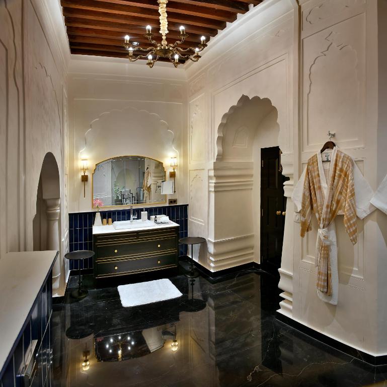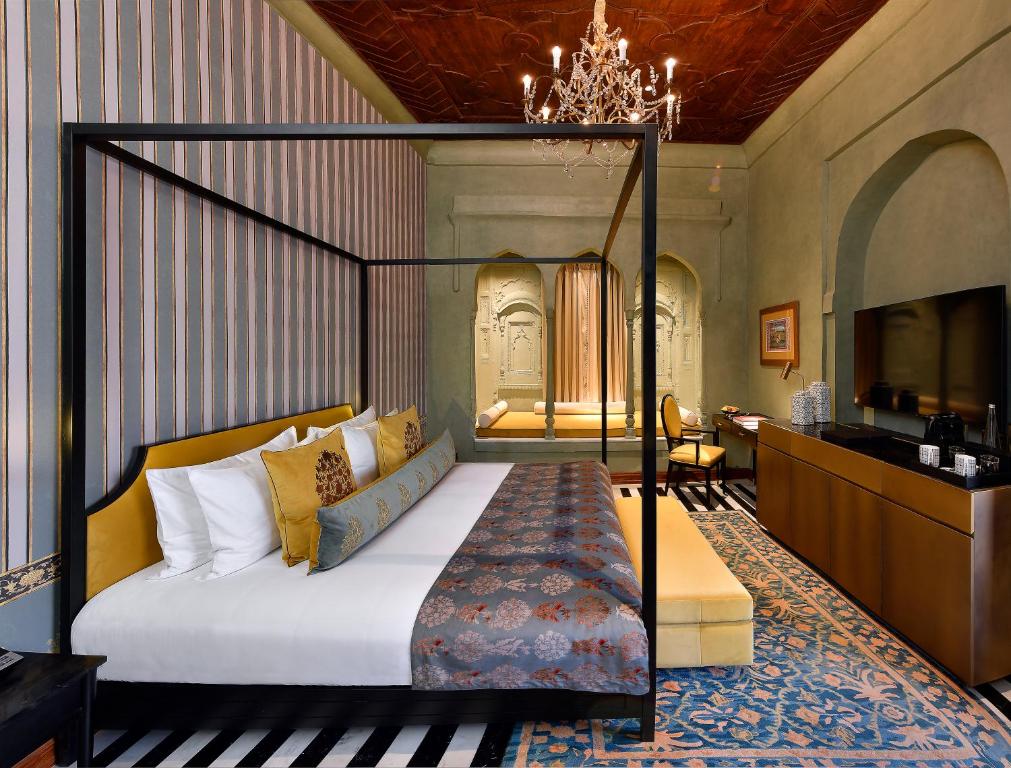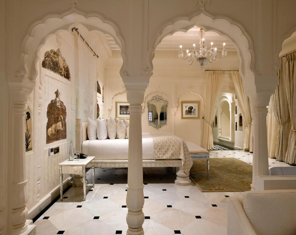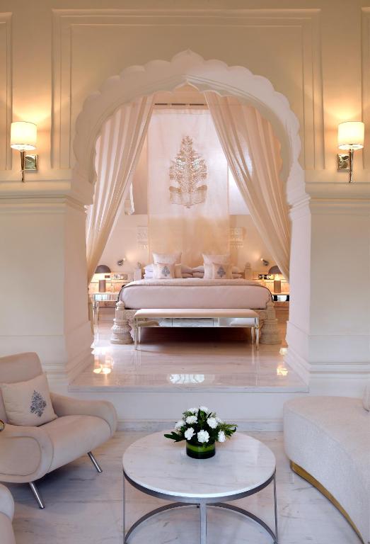 Inside, the design bridges eras with grace: crystal chandeliers glimmer in frescoed halls, rich marble inlaid floors meet silk carpets, and heritage teak furniture contrasts with bespoke contemporary pieces. Luxury here is never loud—it’s royal, not ostentatious.