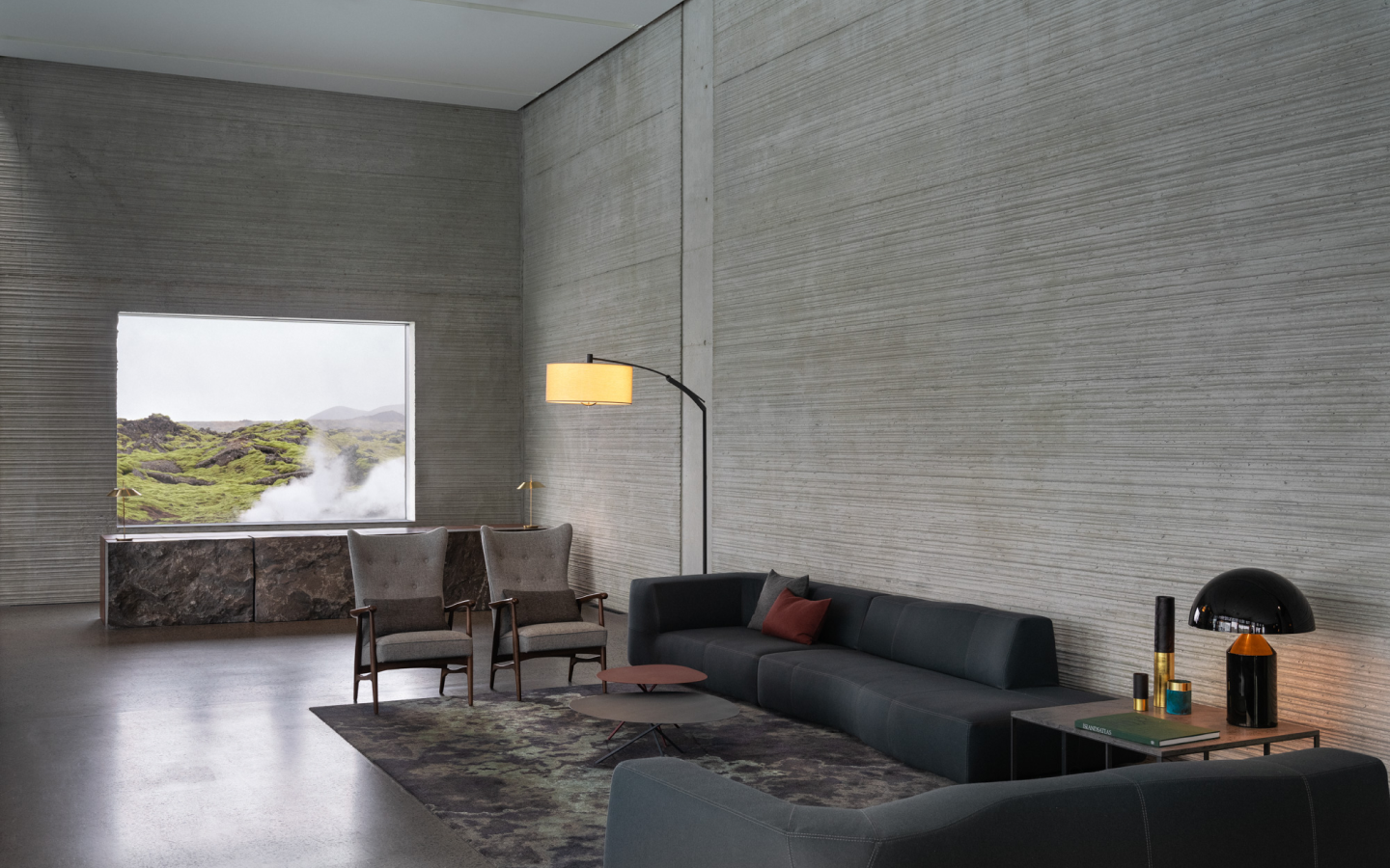 Step inside and the story unfolds in texture and tone. Moss-green and grey-blue carpets echo the colors of the surrounding plains. Walls of lava rock—sometimes left raw, sometimes polished to a silken sheen—form sculptural fireplaces, tactile surfaces, even the bar itself, as if carved by the earth. The lobby is grounded by Icelandic ceramics that span decades, while the interiors weave Italian sophistication into the raw Nordic soul: B&B Italia furniture, iGuzzini’s human-centric lighting, and pulsing light installations that mimic the rhythm of geothermal flow and celestial cycles. It’s not design as decoration—it’s design as geology, as poetry, as philosophy.