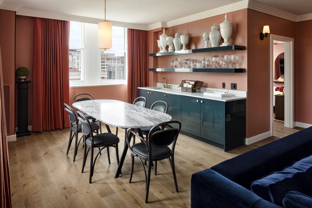 Upstairs, the bank’s past becomes personal. In-room minibars and safes cleverly mimic traditional steel bank safes, a subtle nod to the building’s legacy. Suites like the two-bedroom Riggs Suite add a human layer, honoring former First Ladies with unique porcelain collections and musical tributes, combining historic narrative with contemporary comfort.