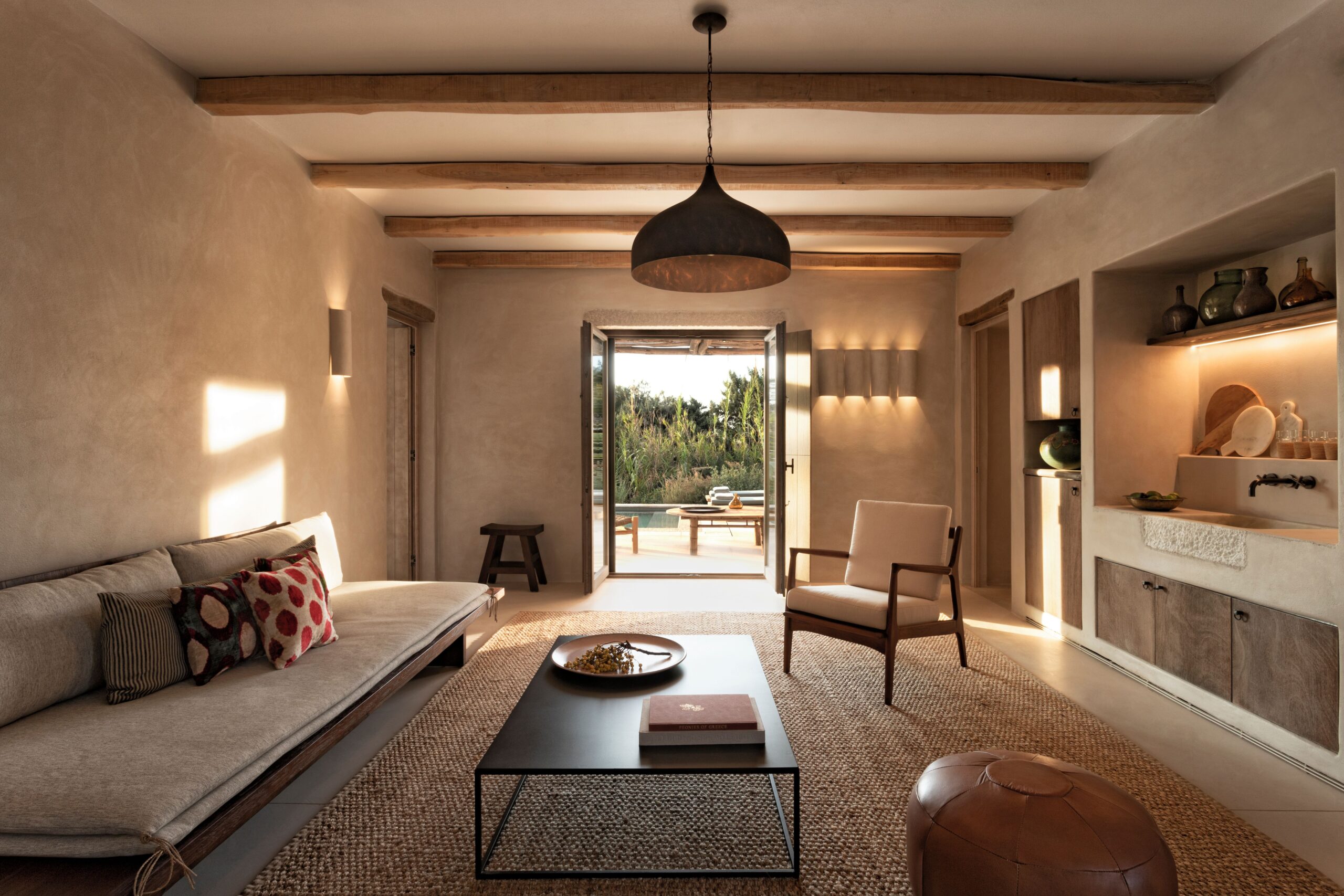 The architecture favors organic integration over Cycladic clichés. Inspired by Antiparos’s dry-stone walls and rural vernacular, each villa is built with plaster surfaces, driftwood four‑posters, reclaimed timber, and earthy textiles, evoking handcrafted elegance without excess. Muted tones and artisanal details let the landscape take the lead—sea views, olive groves, and wild herbs create the real backdrop.