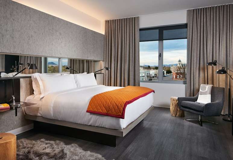The 55 guestrooms are spacious and quietly luxurious, with floor-to-ceiling windows framing expansive desert skies and Marfa’s low-slung streetscape. Neutral palettes of whites, charcoals, and natural woods invite rest, while crisp linens, sleek bathrooms, and curated details like woven rugs and handcrafted furnishings add comfort without clutter. Every room feels like a canvas—serene, simple, and in tune with the town’s artistic DNA.