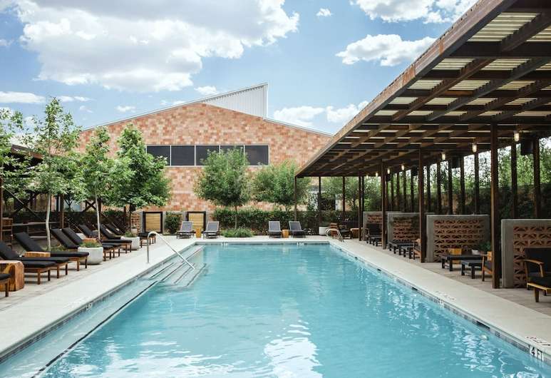 Inside, the hotel channels the stark beauty of the West Texas desert through clean lines, natural materials, and an ethos of functional minimalism. Polished concrete floors, steel columns, and reclaimed wood form the backbone of the interiors, softened by warm textiles and site-specific artworks. Much of the furniture and fixtures were custom-made by local artisans, grounding the hotel in Marfa’s creative community. The result is a space that feels raw yet refined—sparse in decoration but rich in atmosphere.