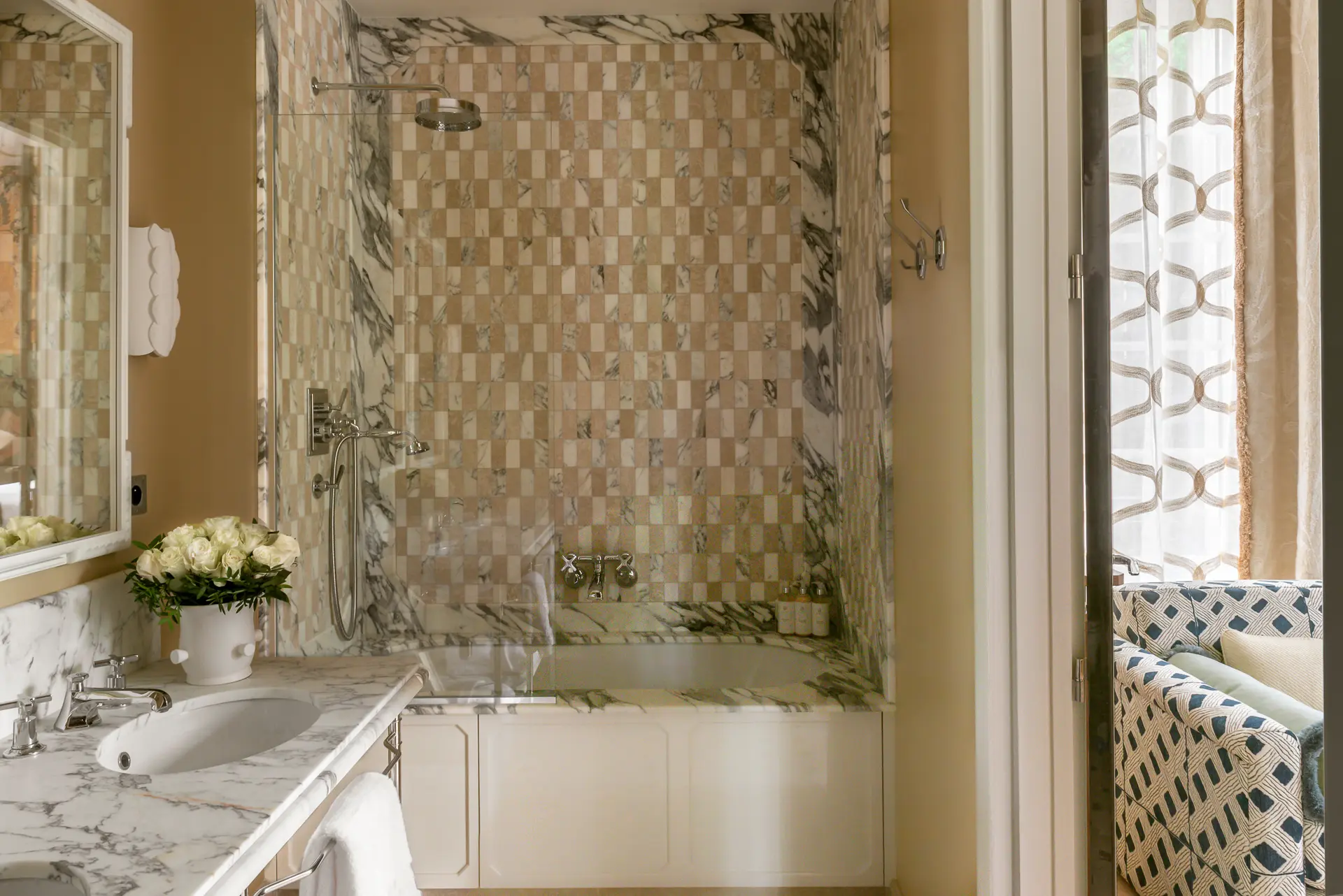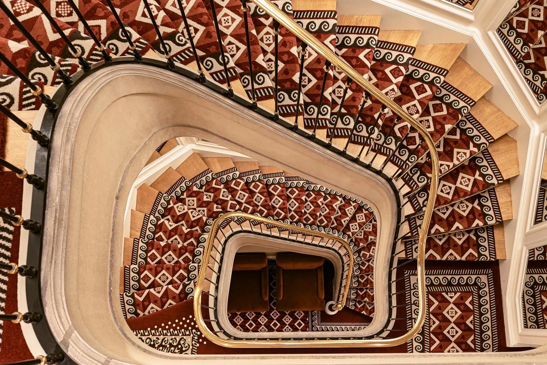 The historic building’s Greco‑Roman bones are softened and enriched with floral Chinoiserie wallpapers, Art Deco accents, and bespoke design elements that celebrate French art de vivre. Interiors balance masculine strength and feminine delicacy: bold architectural lines and robust materials meet soft palettes, rich fabrics, and intricate details like custom “toile de Tours” textiles and sculptural plaster chandeliers by Patrice Dangel. Each space offers visual intrigue, from frescoes and panoramic wallpapers to playful floral and stripe motifs, resulting in a narrative that feels timeless yet dynamic—an aesthetic of romance, heritage, and contemporary craftsmanship.