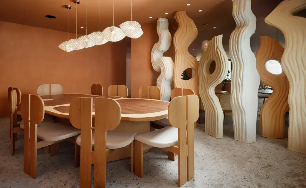 Step into the double-height lobby and you’re welcomed by sandalwood-floral incense, white concrete columns sculpted into art, and a gallery curated by Paris-based Louis Dimension, showcasing works by Sabine Blanchard and Patrick Montagnac. Creativity flows into the everyday: a ceramist-in-residence, Patrick Johnston, throws clay in the lobby, his pieces finding a home throughout the property. The aesthetic is serene but alive, minimal yet tactile.