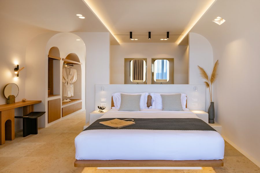 The design merges traditional Santorinian architecture—arched doorways, whitewashed curves, and sun-drenched terraces—with subtle nods to its quarry past: raw stone walls, mineral-inspired palettes, and sculptural geometry echo the volcanic textures of the site.