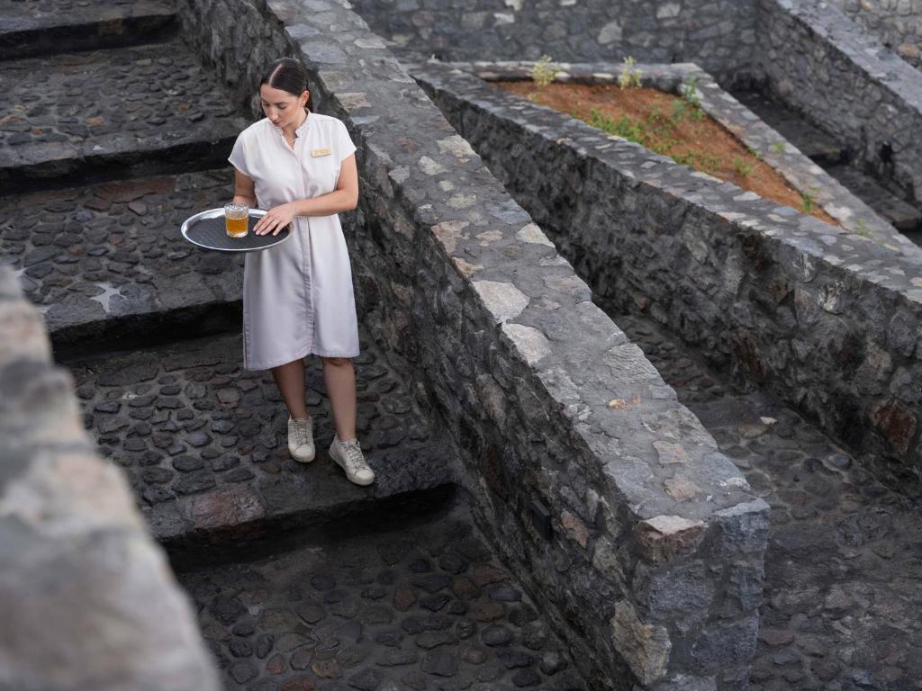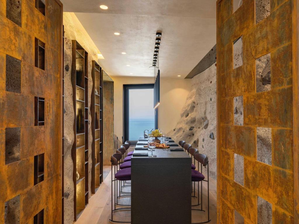 Begin the evening at Rhoē, the resort’s elevated sunset lounge serving bar bites and handcrafted cocktails with uninterrupted views. Then move to Ālme, the fine-dining restaurant where daily-caught seafood, garden-grown herbs, and Aegean flavors are reinterpreted with a light, refined hand. An underground private wine cellar hosts curated tastings featuring volcanic terroir wines, adding yet another sensory layer to this site-specific retreat.