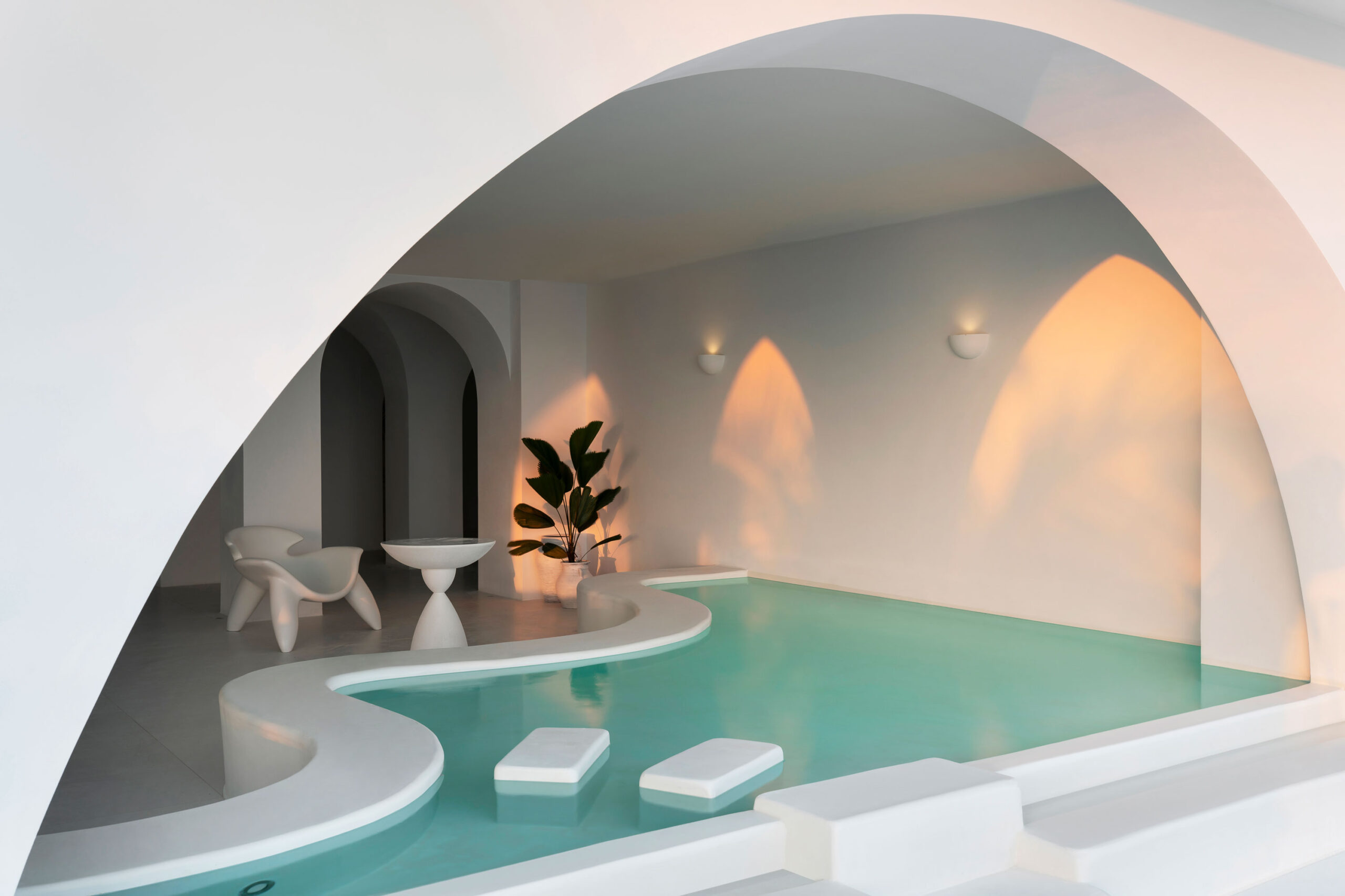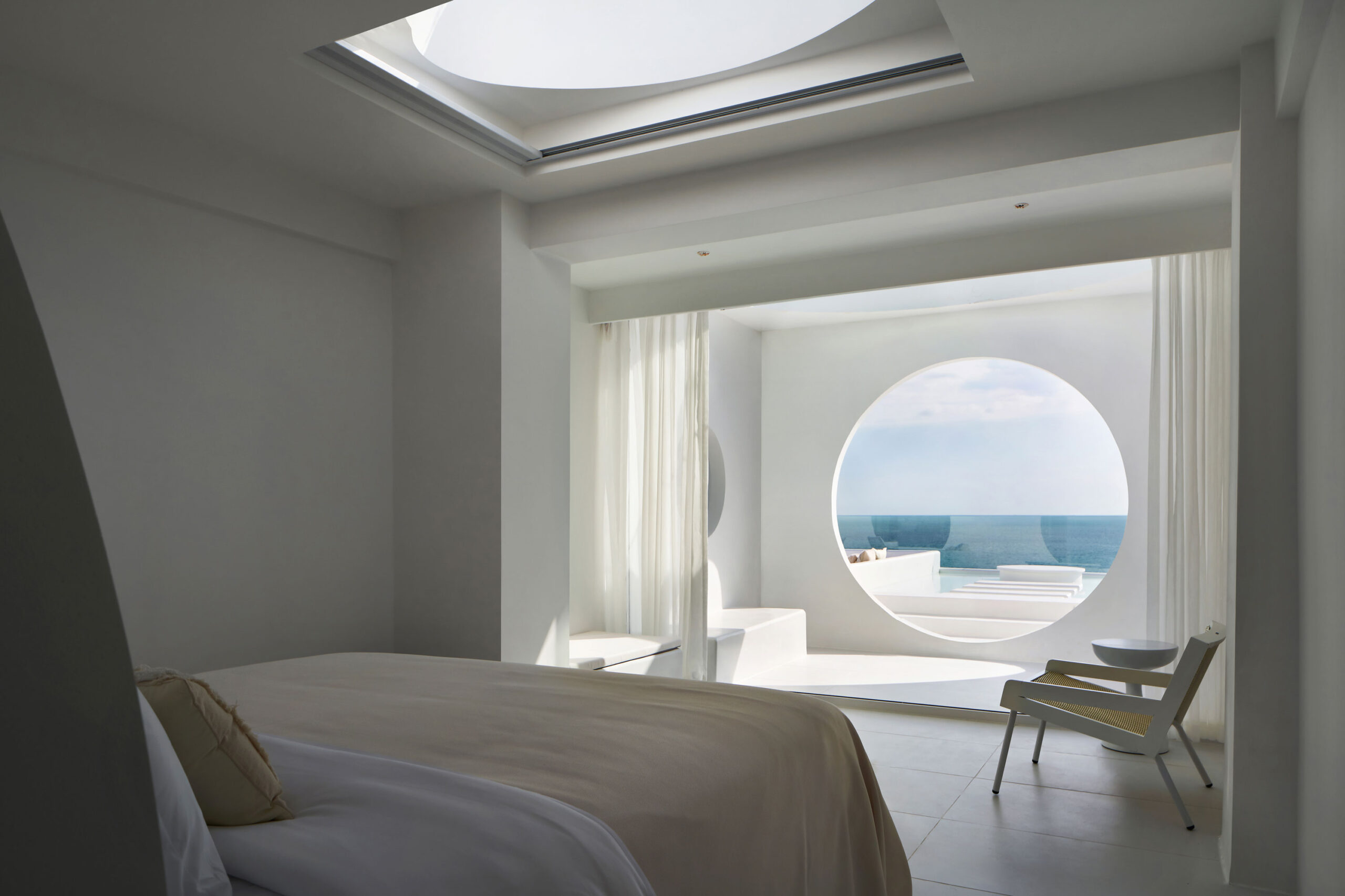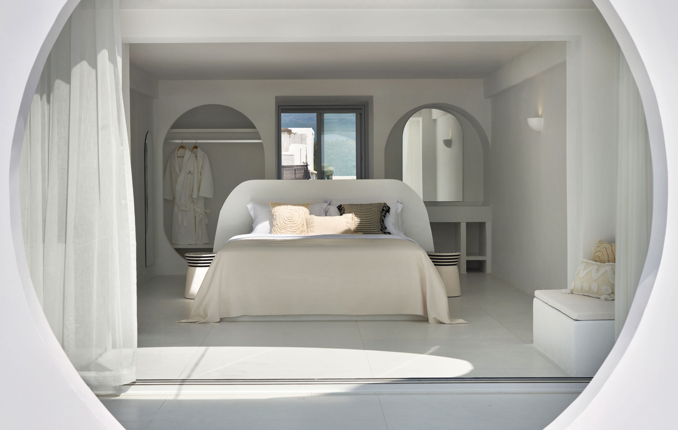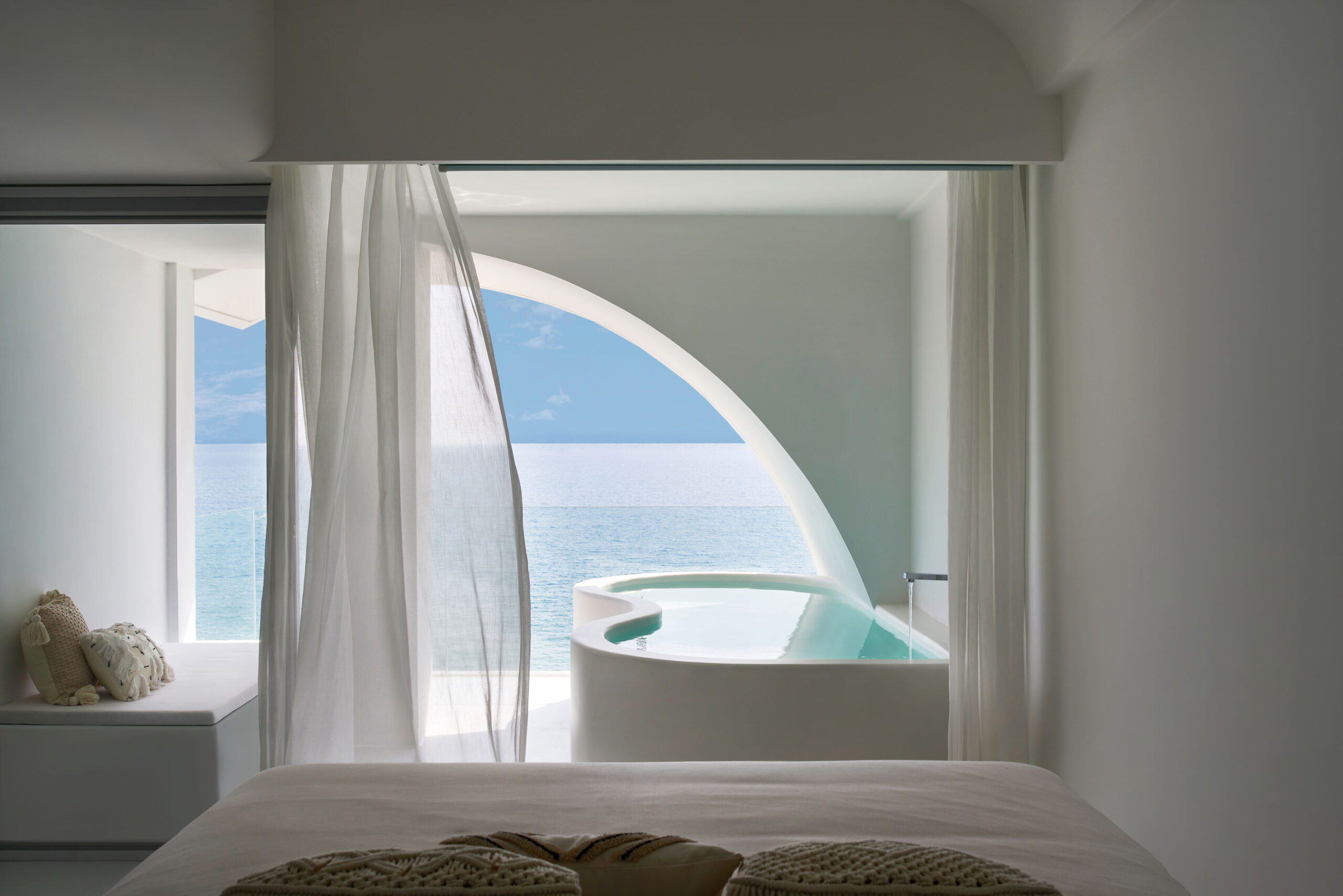 The interior palette is intentionally restrained—white-on-white with subtle natural textures—allowing light and shadow to play the leading roles. Arches, curves, and flowing lines create a sense of softness, while large windows flood the spaces with sunlight and salt-kissed breezes. The result is a mood that’s both deeply calming and quietly cinematic—a sanctuary designed to amplify the elemental beauty outside.