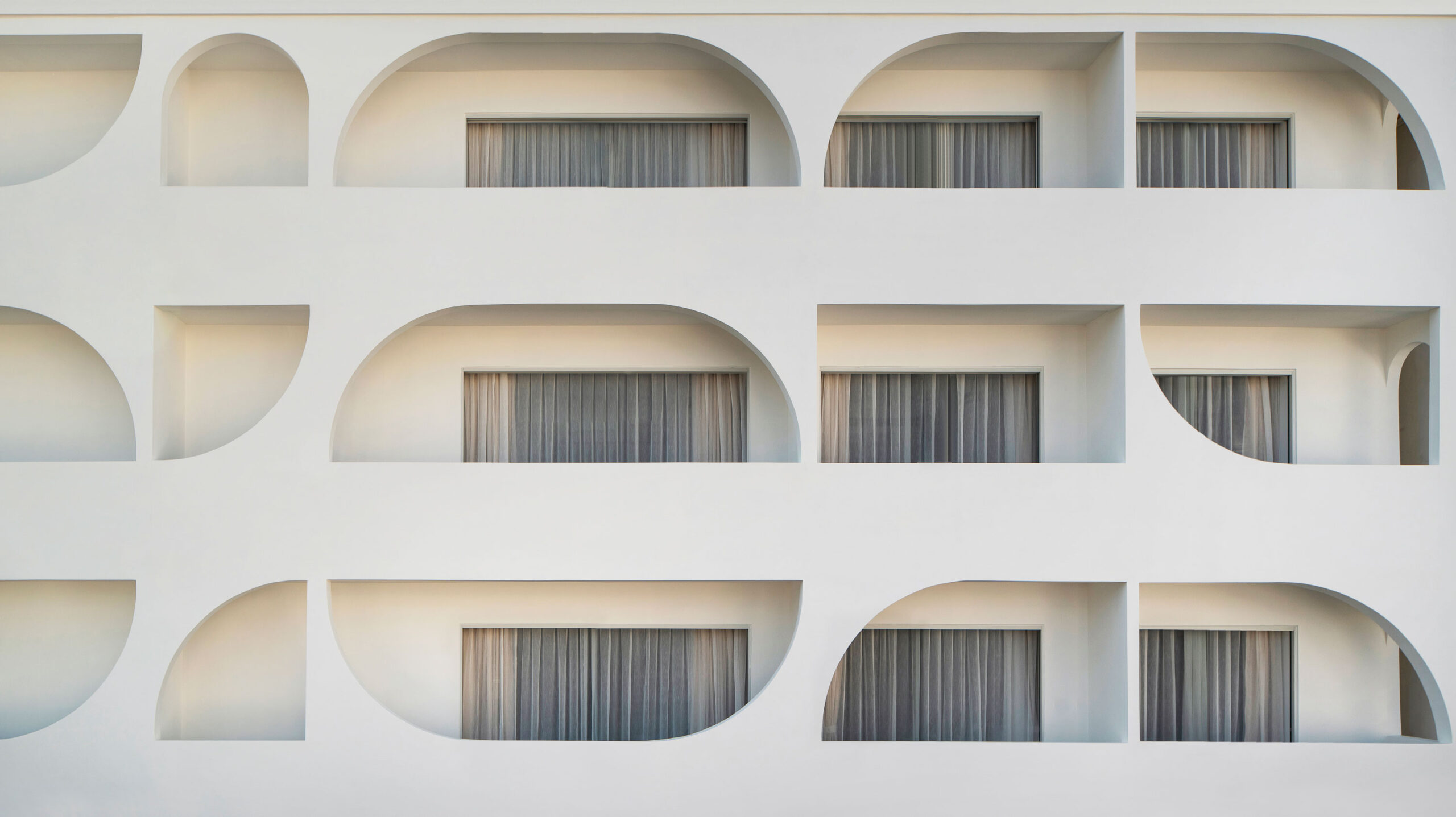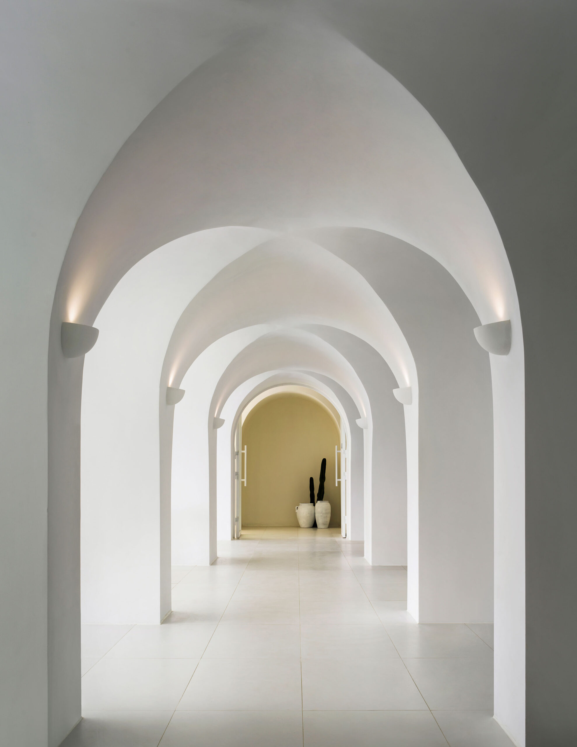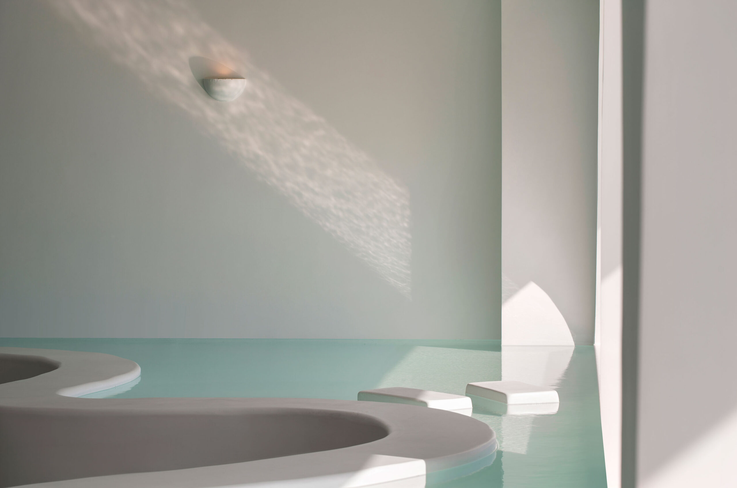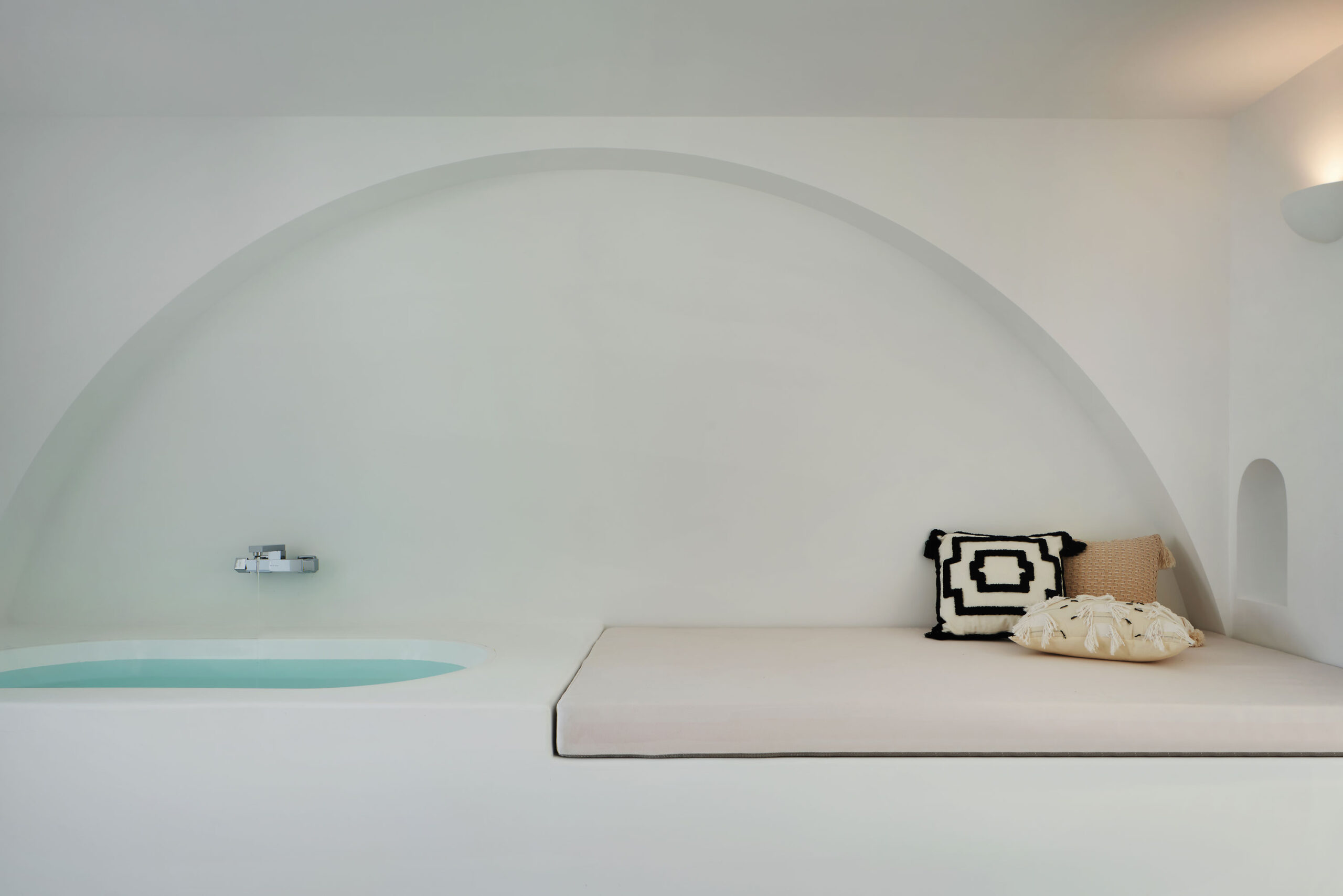 The interior palette is intentionally restrained—white-on-white with subtle natural textures—allowing light and shadow to play the leading roles. Arches, curves, and flowing lines create a sense of softness, while large windows flood the spaces with sunlight and salt-kissed breezes. The result is a mood that’s both deeply calming and quietly cinematic—a sanctuary designed to amplify the elemental beauty outside.