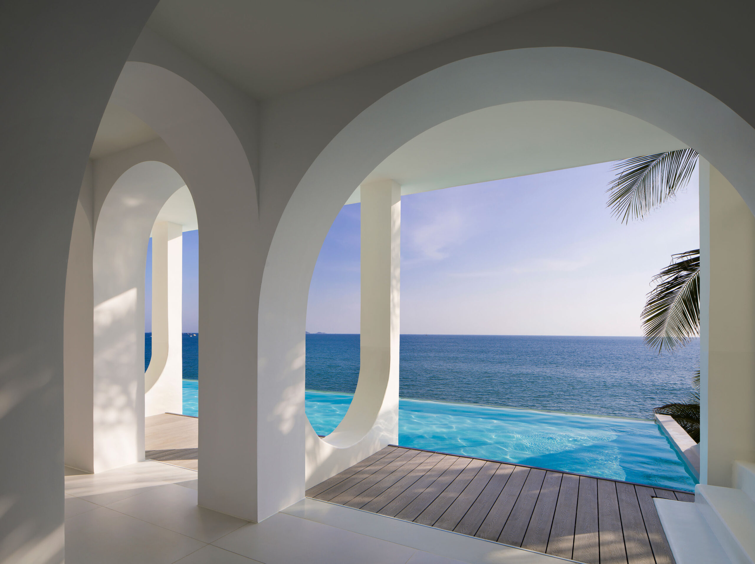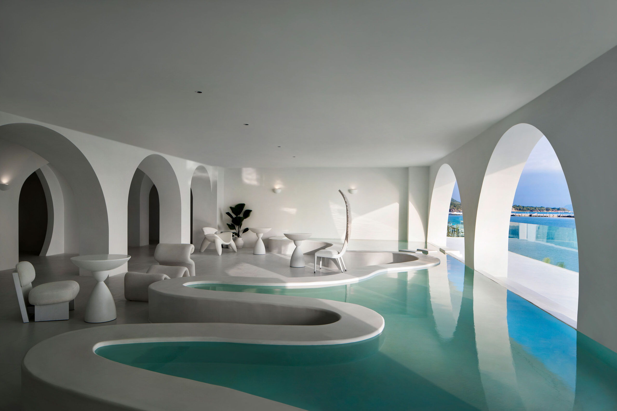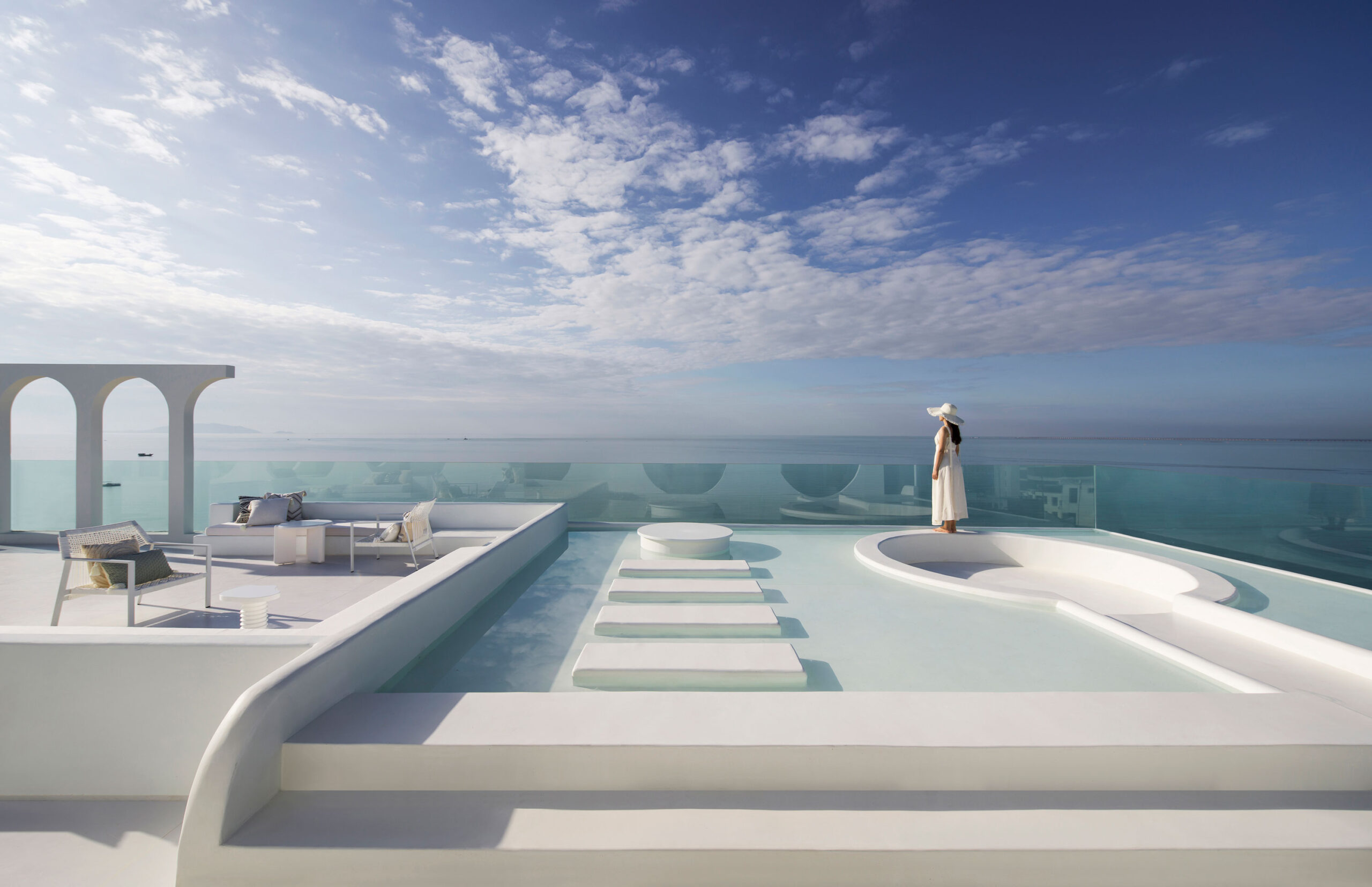 From the outside, Sujuan’s architecture feels sculpted by the sea itself. Soft, undulating façades mimic the rhythm of the waves rolling onto shore, while the brilliant white exterior reflects sunlight like a coastal village perched on the Aegean. Inside, the design language continues: arches frame panoramic ocean views, guiding the eye to the water at every turn. The ground floor is conceived as one fluid, open-plan space, where reception, lounge, photography studio, and high-tea salon merge effortlessly into a seamless social hub. Beyond it, the infinity pool appears to spill directly into the sea—an irresistible invitation to pause, float, and take in the horizon. Up above, the rooftop hot spring bath adds another layer of indulgence, with sweeping views that stretch from the water to the lush green hills inland.