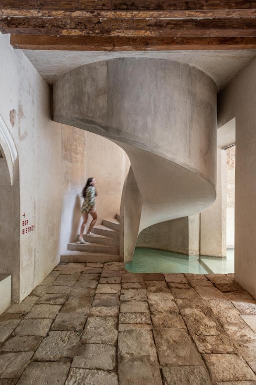 The 21 rooms unfold around these courtyards, many opening directly onto the greenery. Inside, the dialogue continues: vaulted ceilings and original arches meet minimalist interiors and warm-toned furnishings. Concrete walls and clean lines are softened by natural light, local materials, and subtle detailing. The result is a quiet tension—raw yet refined, historic yet unmistakably contemporary.