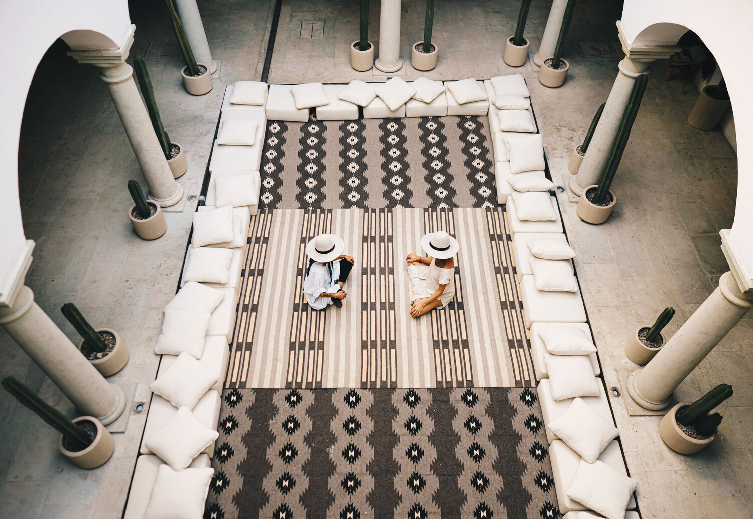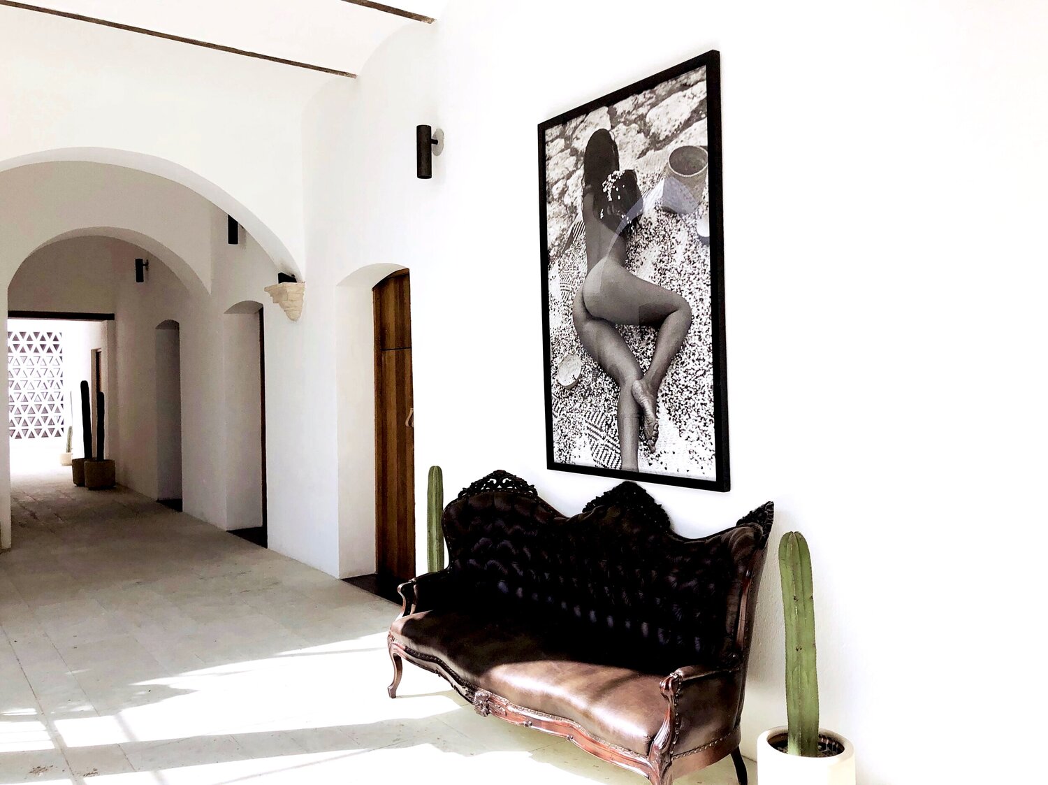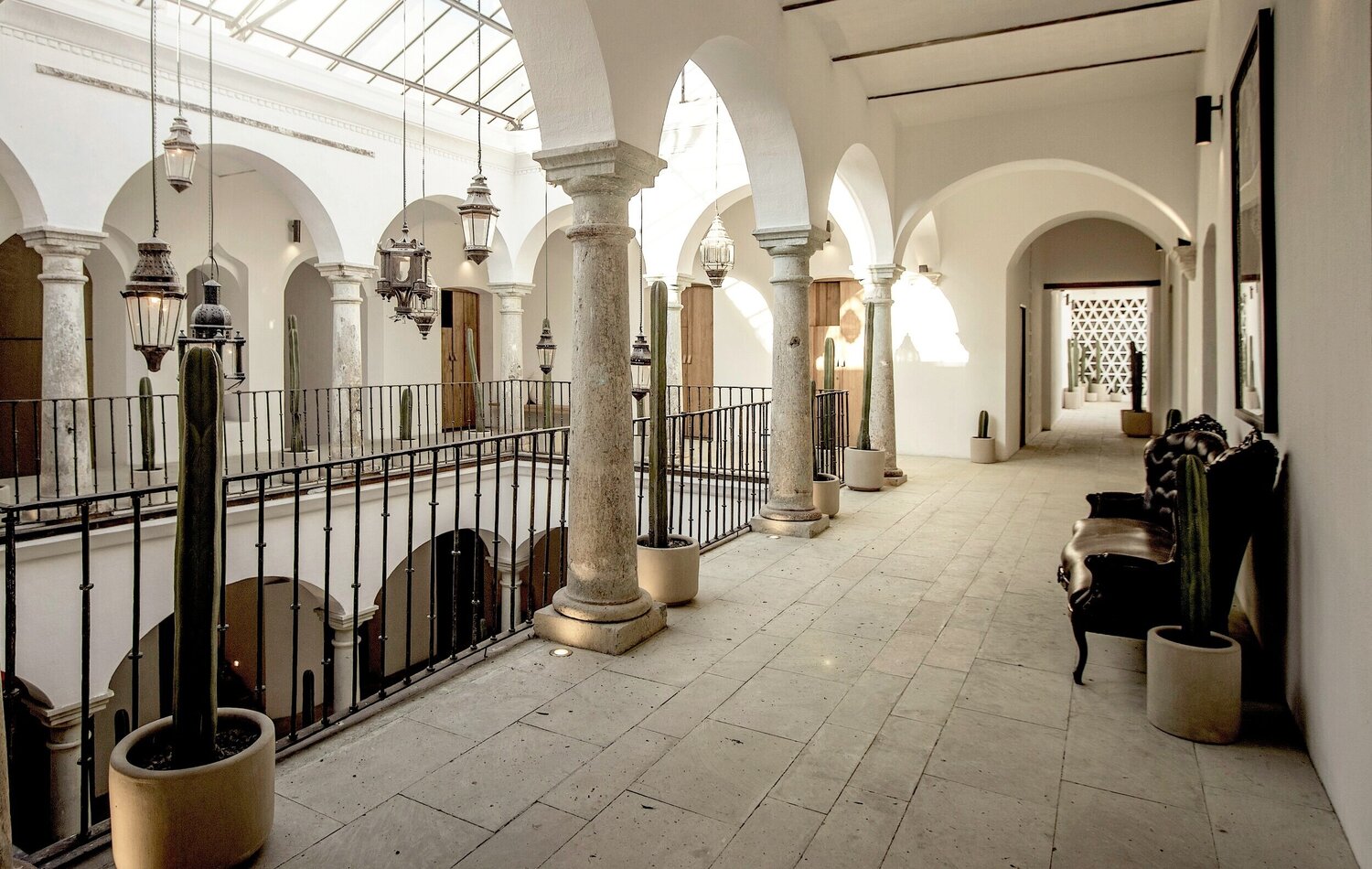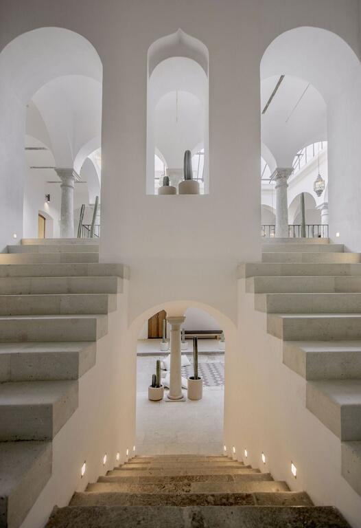 The hotel’s 22 rooms and shared spaces draw strength from simplicity: whitewashed courtyards, vaulted ceilings, bold arches, and monumental columns. These historic features remain intact but are reinterpreted through a minimalist lens, creating a serene atmosphere animated by light and shadow. Splashes of color—pillows, textiles, handmade furniture—introduce warmth and local craft, infusing the austere palette with vibrancy.