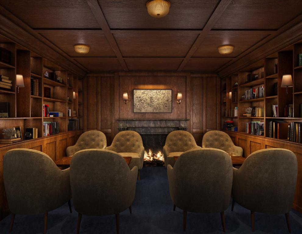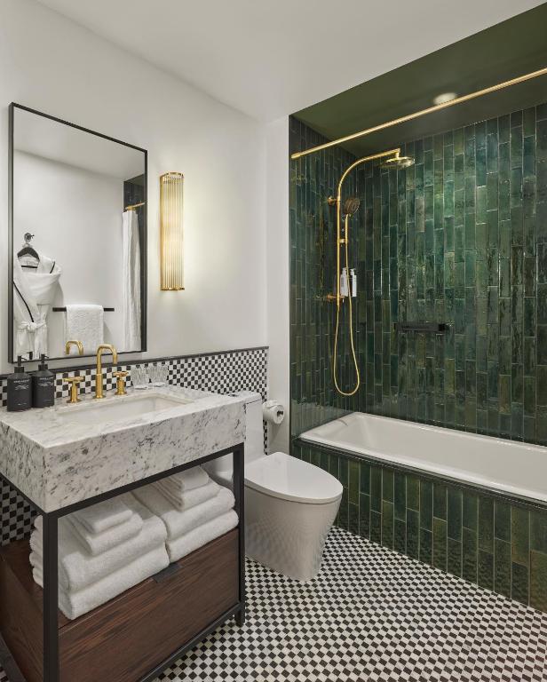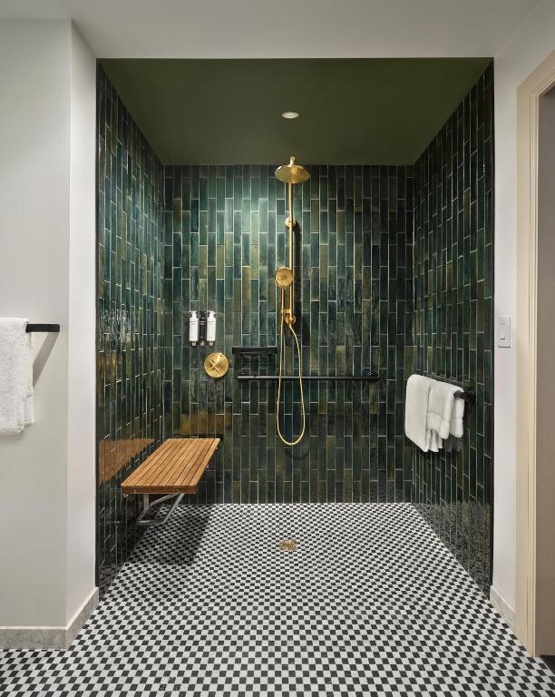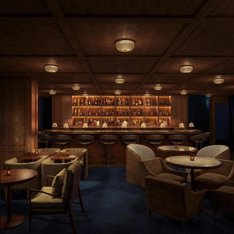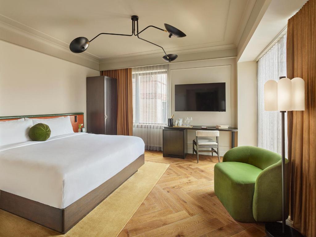 Designer Melissa Bowers drew inspiration from the building’s Bauhaus structure and mid-century modern influences, crafting 80 guest rooms with Scandi wood finishes, burnt orange leather headboards, forest-green armchairs, and houndstooth cushions that channel JFK-era polish with a twist. Analog touches and modern comforts—soft boucle, patinated leather, low sculptural furniture—make the rooms feel purposeful and personal.