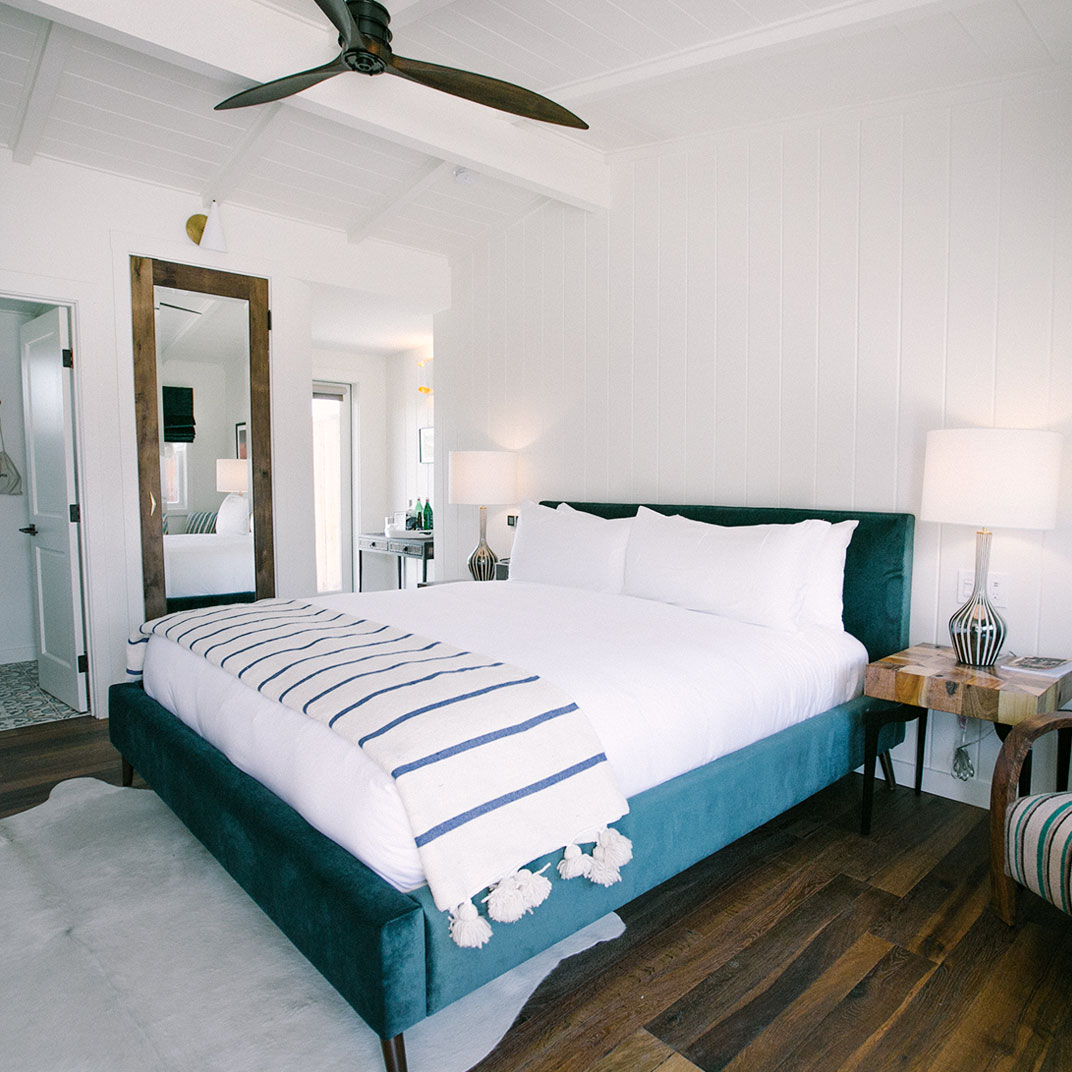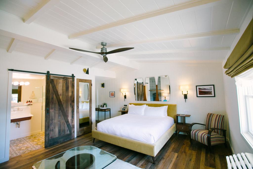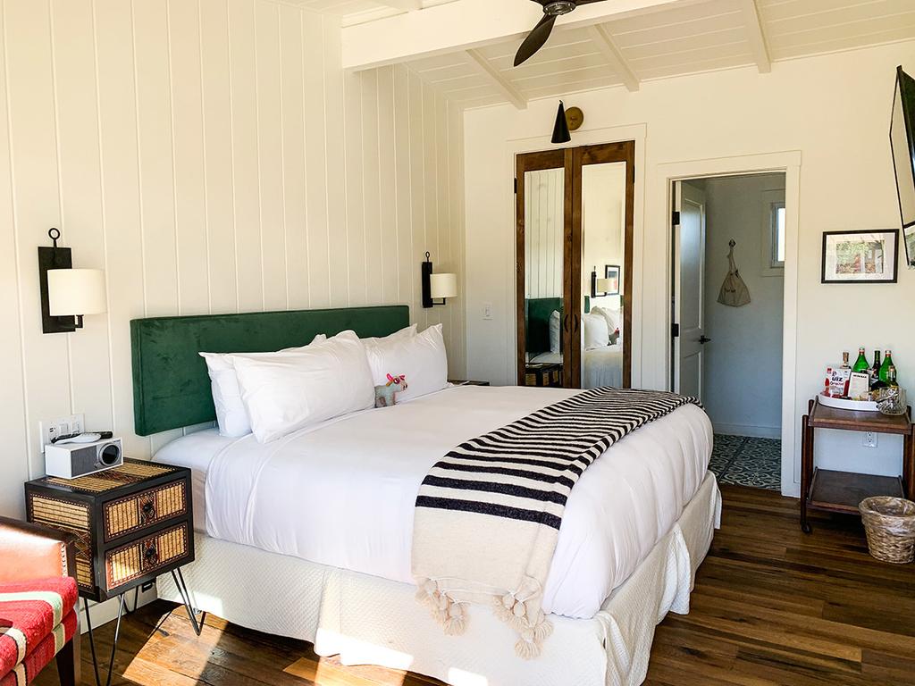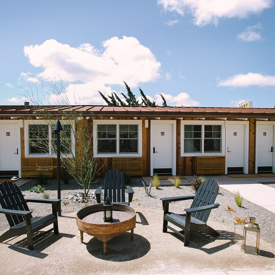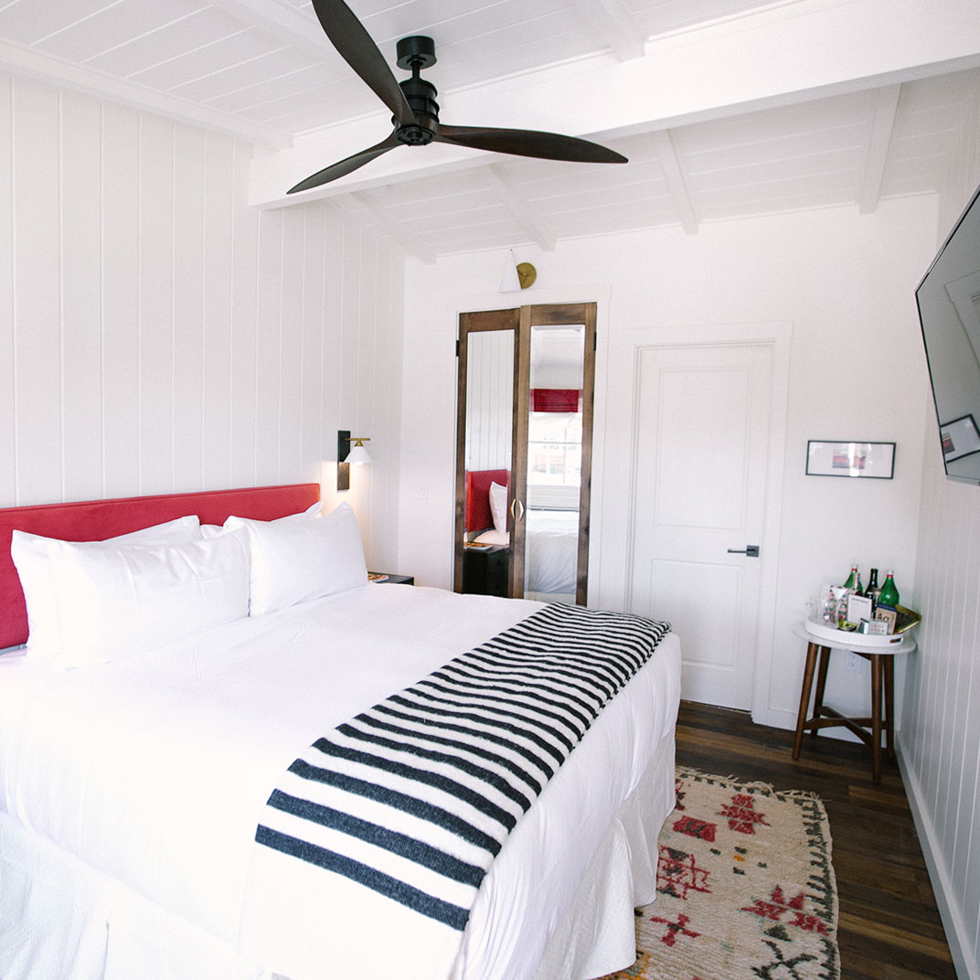 The renovation retains the bones of the original motel while layering in warm hardwood floors, whitewashed walls, mid-century furniture, and textured fabrics. Each guestroom offers a refined take on retro: cozy, light-filled spaces grounded in classic design, yet updated with all the comforts of a contemporary boutique stay. The look is minimal but soulful—nostalgic without kitsch, modern without sterility.