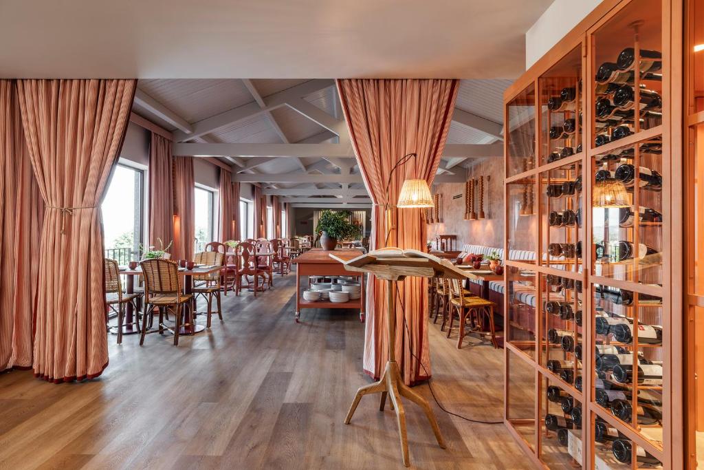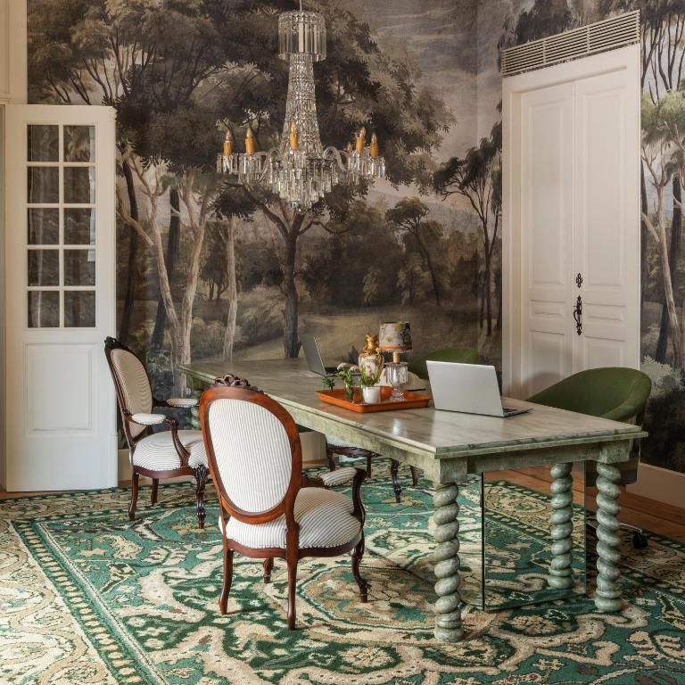 The hotel’s 29 suites are divided between two distinct wings, each with its own personality. The Modern Building, home to 22 suites including six duplexes, embraces bold color palettes, fine linens, and a mix of vintage accents and contemporary design pieces. Each suite feels unique—playful yet refined, a reflection of Portugal’s joyful approach to modern hospitality. In contrast, the Manor House is pure romance. Past the intimate Honesty Bar and the richly paneled lounge, seven bespoke suites await. Each features hand-painted panoramic murals, inspired by the surrounding countryside, where verdant hills and local flora unfold across the walls like living tapestries. These rooms, awash in soft light and fine detail, feel like chapters in an artist’s love letter to the land.