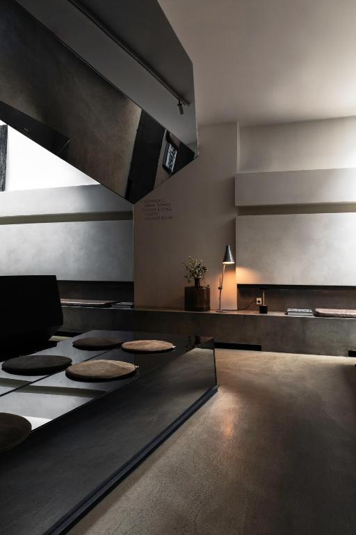 Long, winding corridors intentionally mimic the feel of the surrounding streets with rough plaster, asphalt-effect flooring, and streetlamp-style room numbers. Inside, the rooms adopt a cleaner, moodier tone: grey palettes, crisp white linens, moulded wooden headboards, and bespoke open storage units holding kettles, irons, and essentials. Bathrooms are functional in white tile with REN amenities. From compact single rooms to penthouses with skyline views, layouts are efficient and quietly stylish.