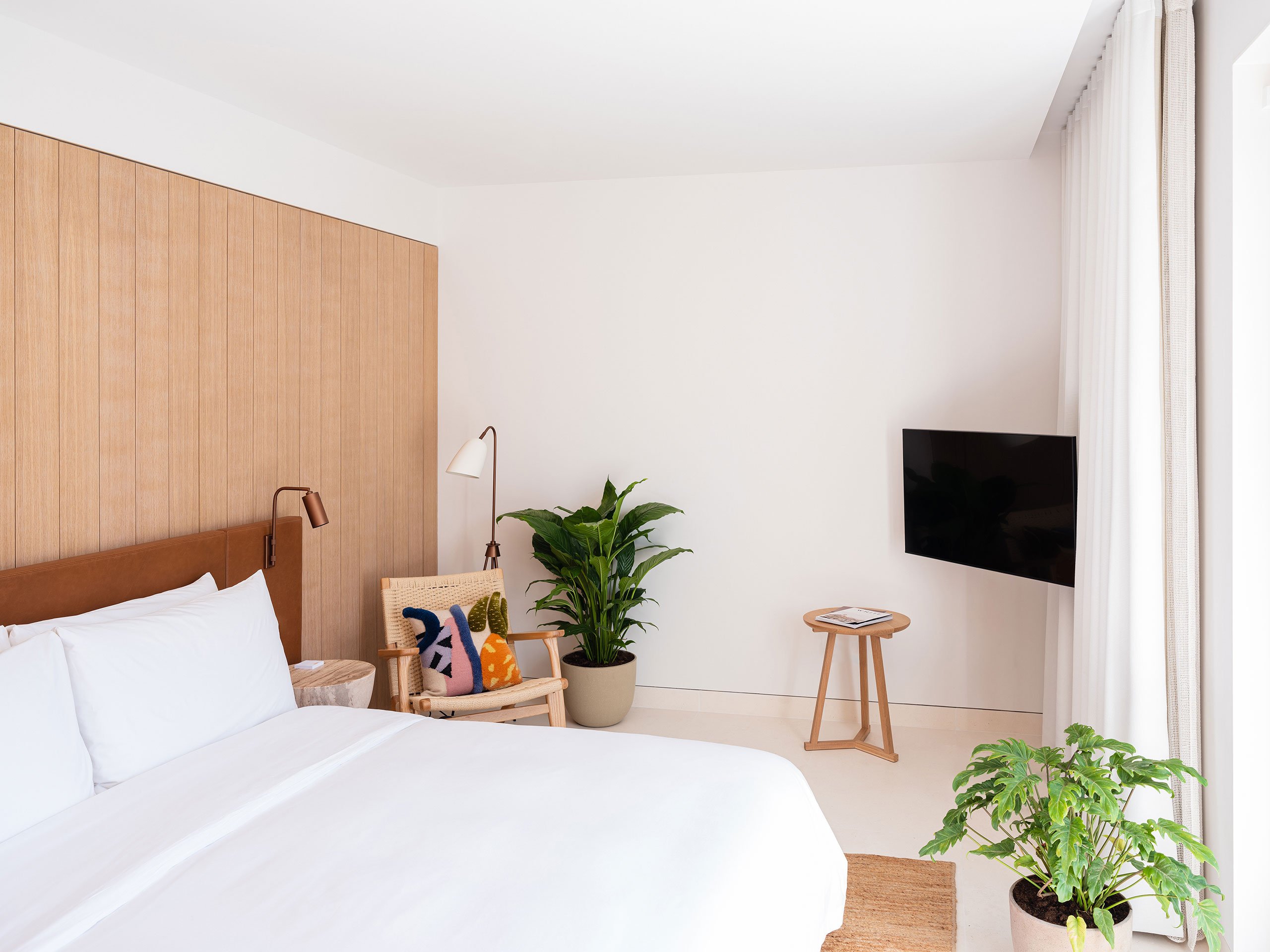 The 67 guest rooms in the main hotel are understated and airy, channeling mid-century elegance with natural timbers, linen accents, and a soothing palette that mirrors the coastline just beyond. It’s an oasis for design lovers—and a quiet contrast to the vibrant public spaces. At street level, the farm-to-table restaurant serves up locally sourced dishes from morning to midnight, while the rooftop is a destination in itself: panoramic views, sparkling pool, DJ sets, and sunset cocktails that roll effortlessly into night.