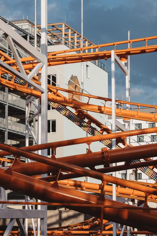 Tucked right across from the legendary Prater amusement park—with its soaring Ferris wheel and timeless fairground magic—Superbude Wien Prater makes a statement from the moment you arrive. This is not a polished, palatial hotel. It’s something far more compelling: an industrial-chic playground that thrives on wit, creativity, and a rebellious streak. With exposed pipes, raw concrete walls, and furniture crafted from clever repurposing, it’s a space that wears its character proudly, turning imperfection into inspiration.