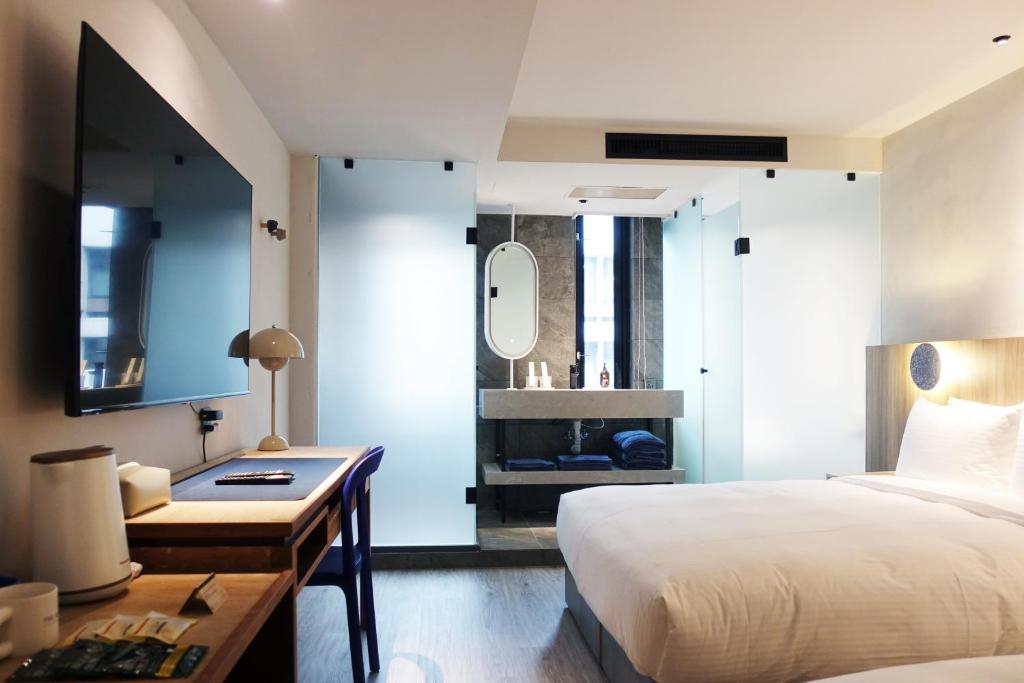 The lobby doubles as a café-style lounge, where travelers and locals drift in for espresso, laptops, or quiet conversation. Walls often showcase rotating works from emerging Taiwanese artists, giving the space the feel of a living gallery. Beyond the hotel itself, The Blue is deeply embedded in its neighborhood. Steps away from Taipei Main Station and a short walk to the historic Presidential Office Building, the hotel is both a retreat and a launchpad—inviting guests to explore the city’s cultural layers, then return to a space of reflection.
