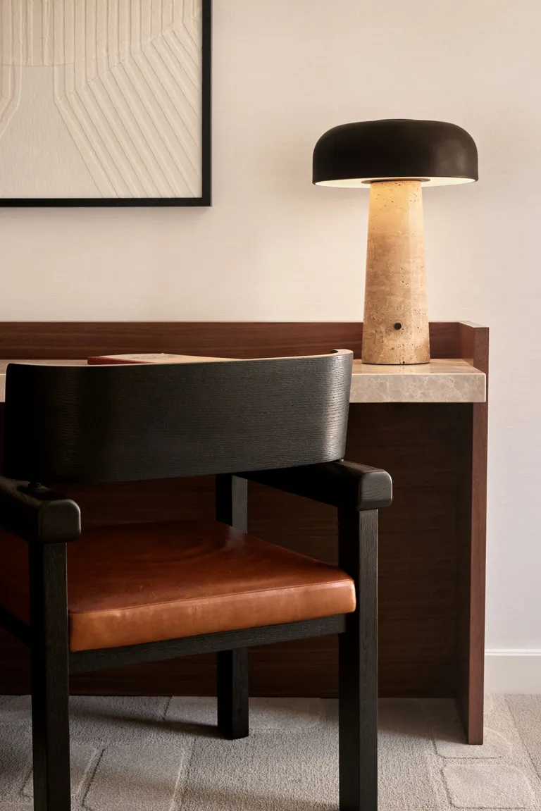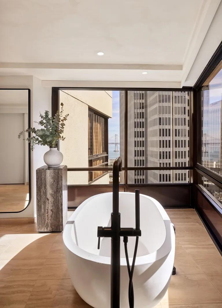 The guestrooms balance architectural clarity with comfort. Large windows frame urban views, while interiors are grounded in a palette of natural stone, oak, and soft textiles. Art and accessories add subtle storytelling touches, weaving San Francisco’s cultural history into the guest experience without overpowering the serenity of the design.