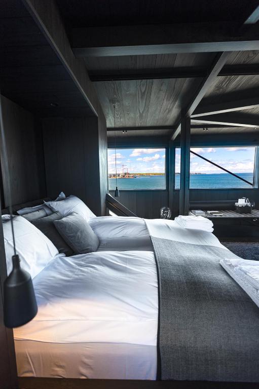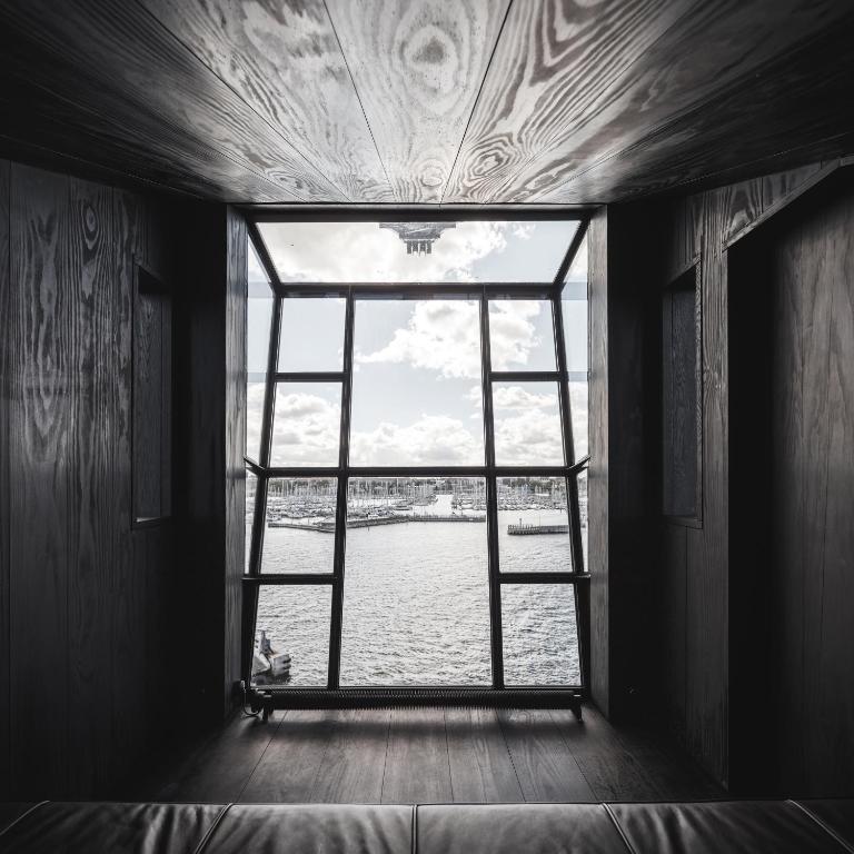 The top-floor KRANE ROOM is an immersive study in monochrome. Entirely rendered in black—from coal-inspired walls to charcoal-toned furnishings—the interior pays homage to the crane’s past while heightening the present. Jonas Bjerre-Poulsen of Norm Architects curated the space with restraint and precision, allowing the all-black palette to create a calming, meditative quiet. The darkness is not oppressive; instead, it transforms the massive windows into living artworks, framing the sea and sky in vivid clarity. As light shifts throughout the day, hundreds of shades of black unfold, revealing textures, gradients and a hypnotic sense of depth. At night, the interior becomes cocoon-like—private, intimate, deeply atmospheric.
