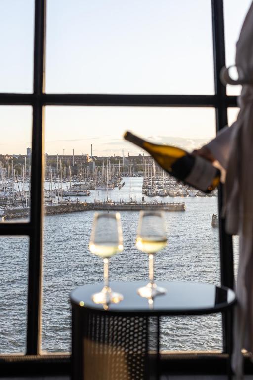 On the spa level, the design language shifts from black to soft grey stone, but the essential philosophy remains the same: the views are everything. The floor-to-ceiling glass façade opens the harbour panorama like a widescreen film. Two freestanding bathtubs face the water, while a glass-enclosed sauna offers an elevated vantage point over the pier. The atmosphere is hushed and meditative; the architecture fades into the background so the changing light and weather become the true design elements. As Kastbjerg explains, “With the winter weather in Denmark, we couldn’t really have a spa outside. But who wants to sit inside and miss the nature?”