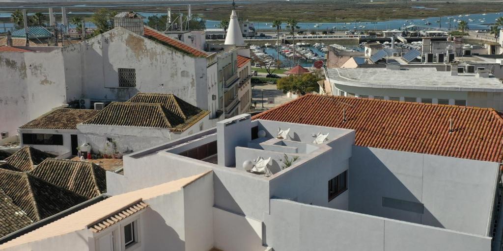 At sunset, the building reveals its secret weapon: a rooftop terrace that looks out over Faro’s terracotta rooftops, church towers, and the ever-shifting colors of the Ria Formosa lagoon beyond. Here, cocktails or local wines flow easily, accompanied by soft breezes and the glow of the southern Portuguese sky. It’s less about spectacle and more about rhythm—the kind of place where you ease into the evening, immersed in atmosphere rather than noise.