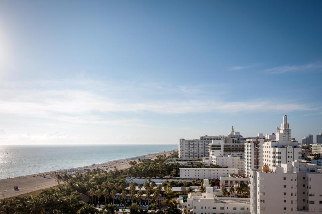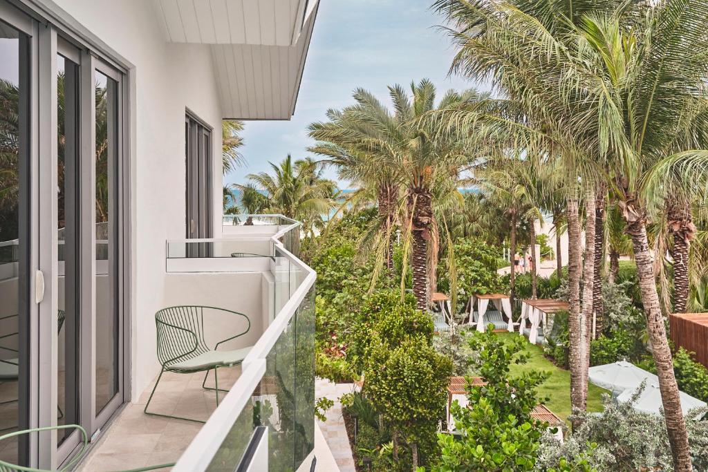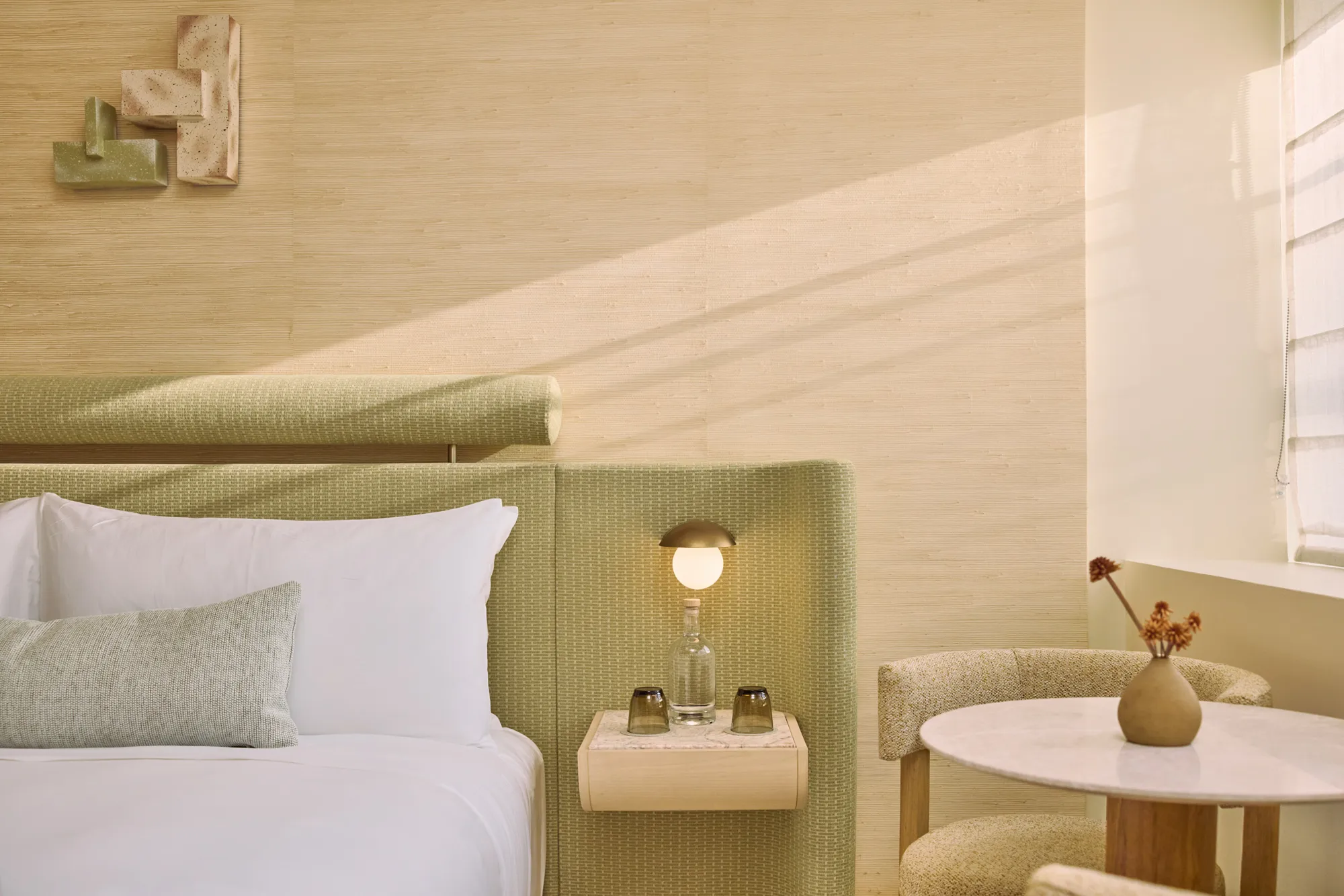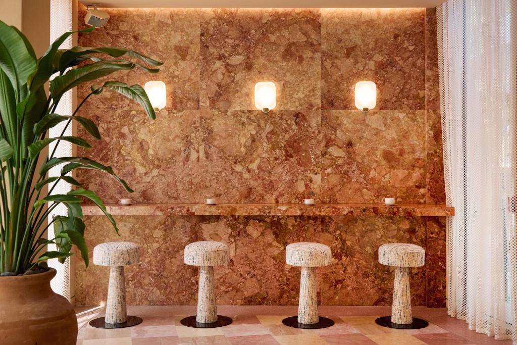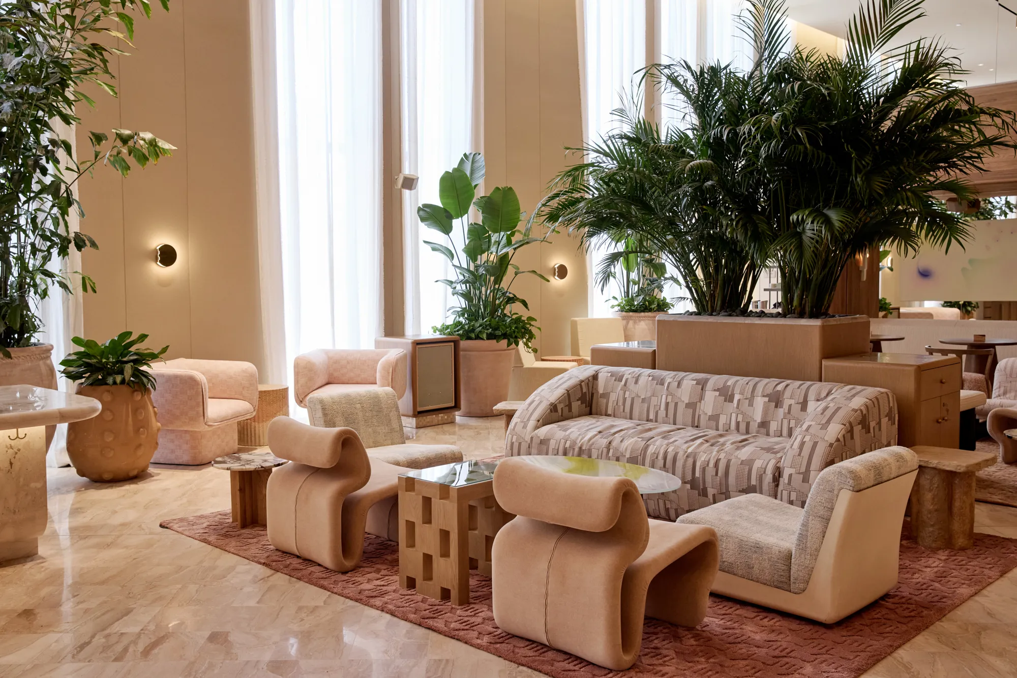 London and Barcelona-based ADC Atelier led the reinvention, honoring both the distinctive 18th Street façade and the iconic vintage diving board at the pool deck, while introducing warm materials like honed travertine, Perlino marble, wood accents and soft moss-green and terracotta tones to echo Miami’s stylistic heritage. Public art—through silk installations, ceramic sculptures, and Latin American works—further cements the hotel as a cultural hub amidst its tropical canvas.