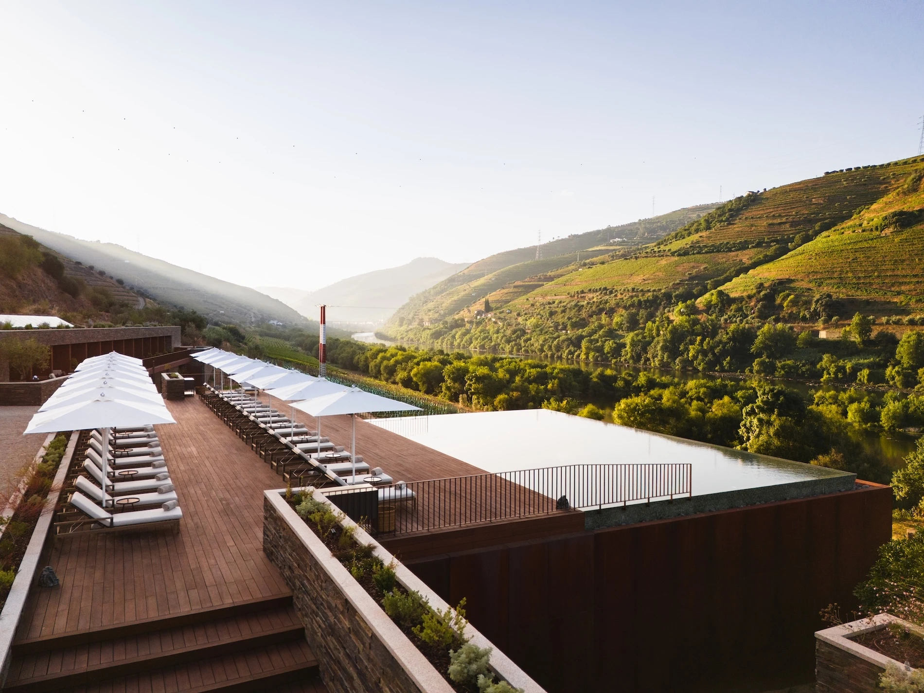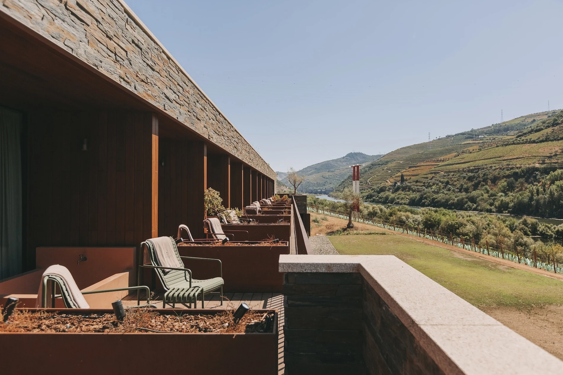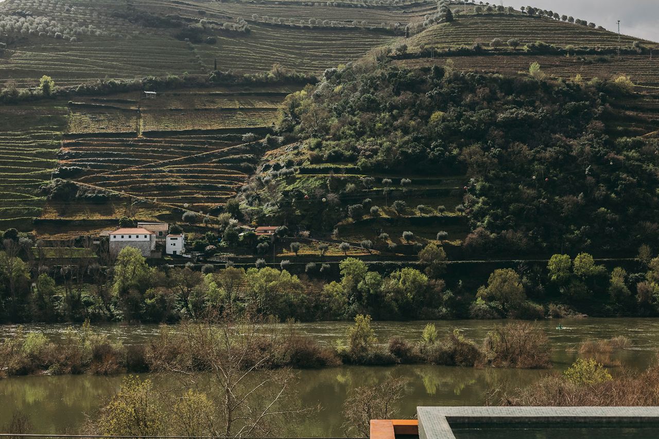 The architecture at Torel Quinta da Vacaria doesn’t dominate the Douro—it harmonizes with it. Original estate buildings have been lovingly restored, their thick schist walls and traditional forms preserved, while corten steel, local wood, and glass introduce a contemporary counterpoint. The new semi-subterranean wing, which houses additional rooms and the spa, is a masterstroke of subtlety—integrated into the hillside to preserve the estate’s historic silhouette and minimize its visual footprint. Everywhere you look, the landscape is the star. Terraced vineyards cascade toward the Douro River, their greens and golds shifting with the seasons. Architecture and nature aren’t separate here—they are two halves of a single, breathtaking whole.