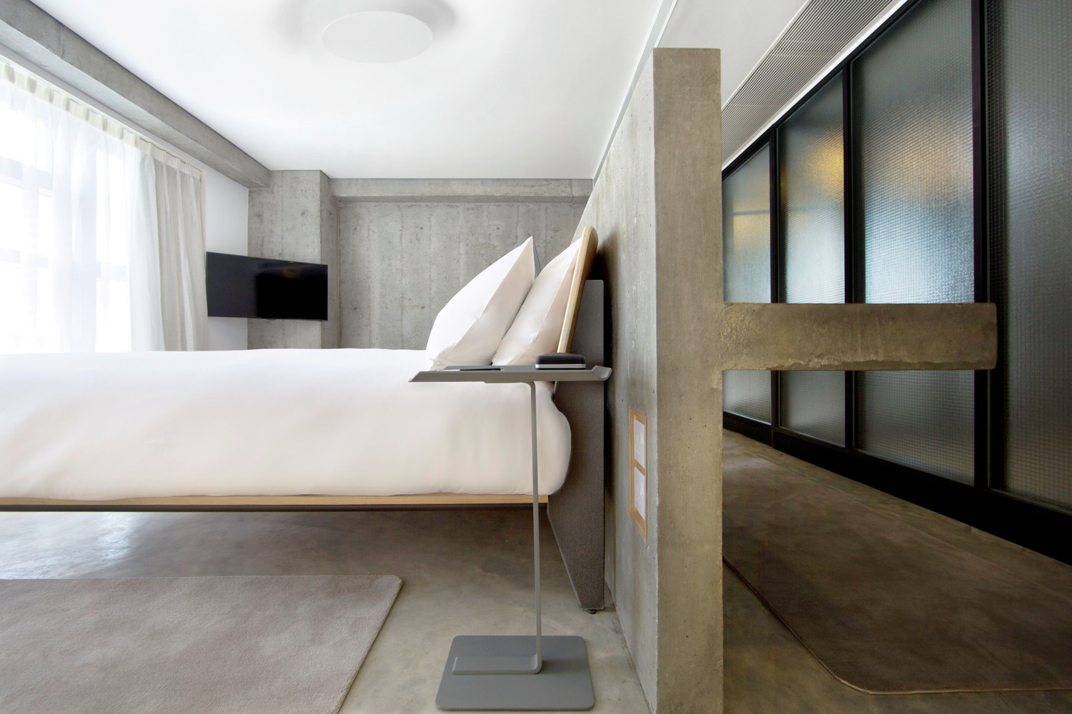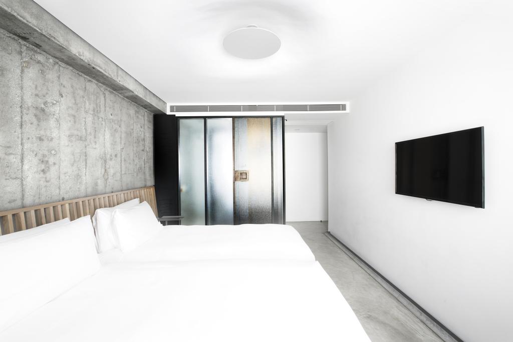 64 rooms, all variations on the same monastic signature: concrete walls, pale wood, severe symmetry, slivers of light. The Premier Rooms (30 sqm) are the sweet spot — especially for Hong Kong. Plush king beds. Ultra-quiet. Freestanding minimal desks. Everything essential, nothing ornamental. Soundproofing is excellent. Sleep is deep. This is where the aesthetic becomes physical relief.