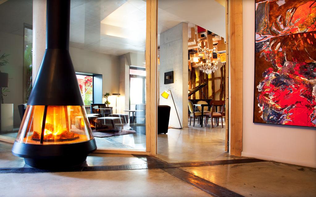 Created by brothers Xabier and Joseba Aramburu, the building resembles a precarious tower of blocks scattered across the village edge. Corrugated concrete, slate-lined hallways and sharply angled public spaces add a cinematic quality — reception is even carved into a cave-like nook. Decorative pieces nod to local winemaking: massive barrels hang from ceilings, giant blown-glass vessels glow softly in corners, and warm lighting turns industrial edges into theatrical moments.