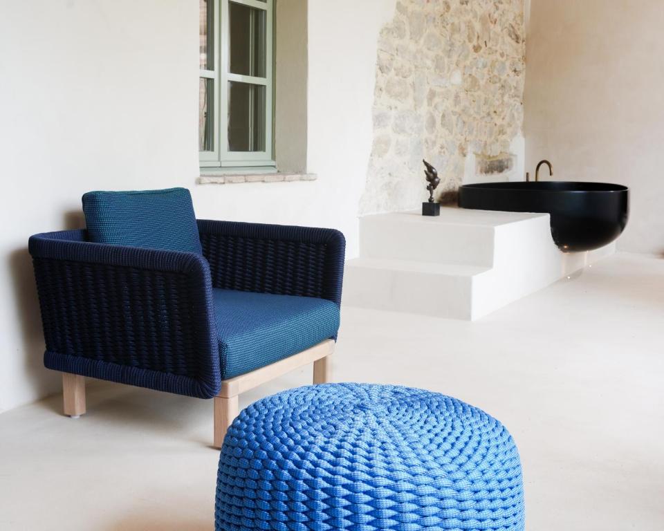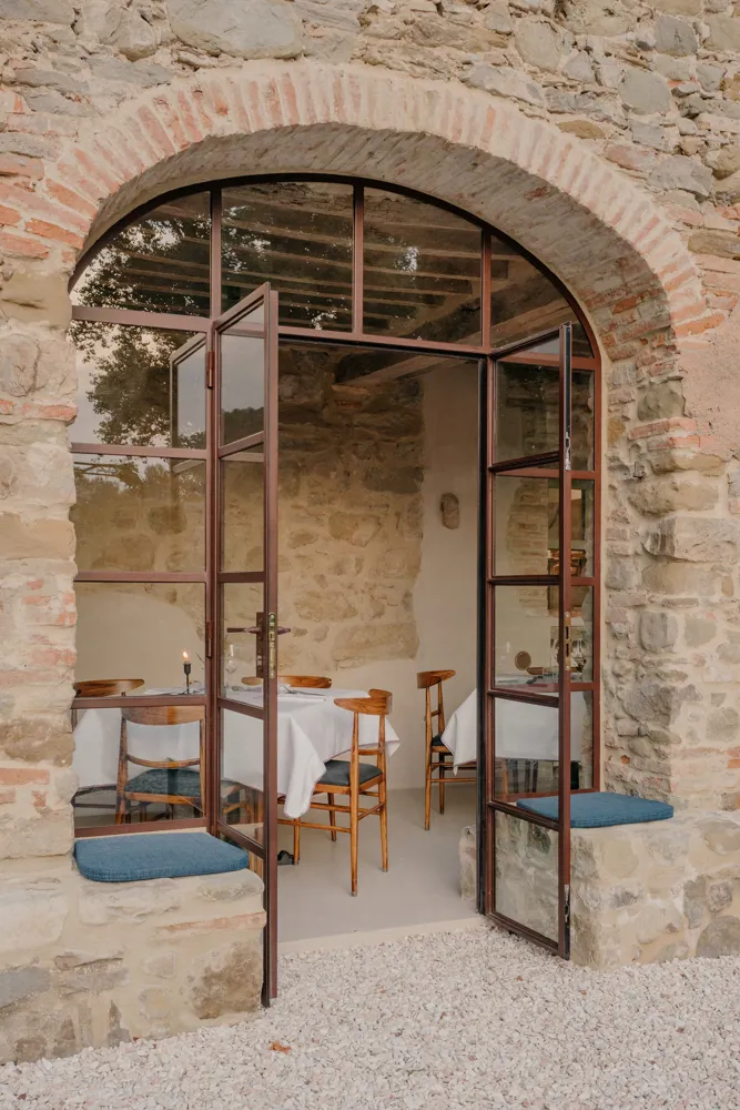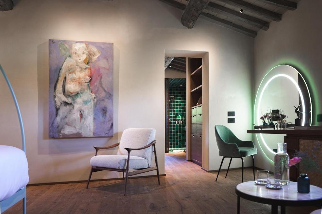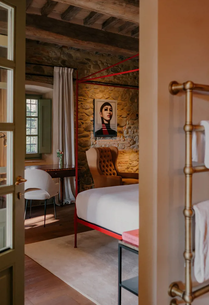 Minimalist, mid-century-inspired furniture mingles with rustic details: stone fireplaces, handcrafted Cotto Etrusco tiles, and bathtubs poised on private loggias shaded by breezy curtains. A separate annex offers four suites with private gardens, each thoughtfully furnished by Varaschin. The grounds unfold like a miniature Italian village, anchored by a central piazza where the former church now serves as a minimalist event space.