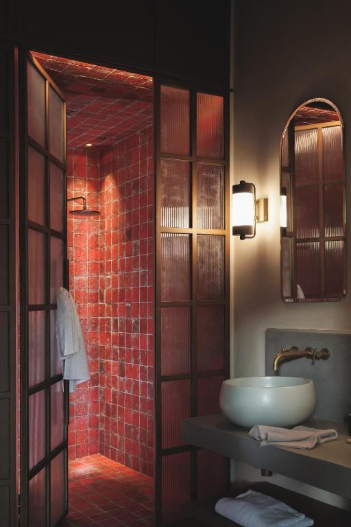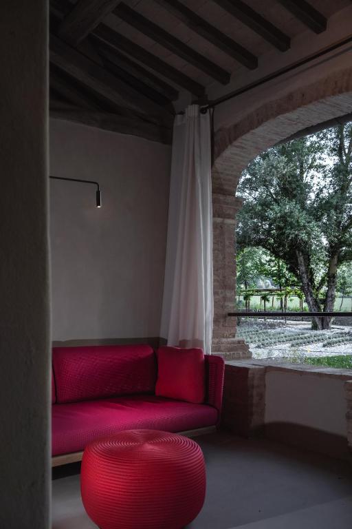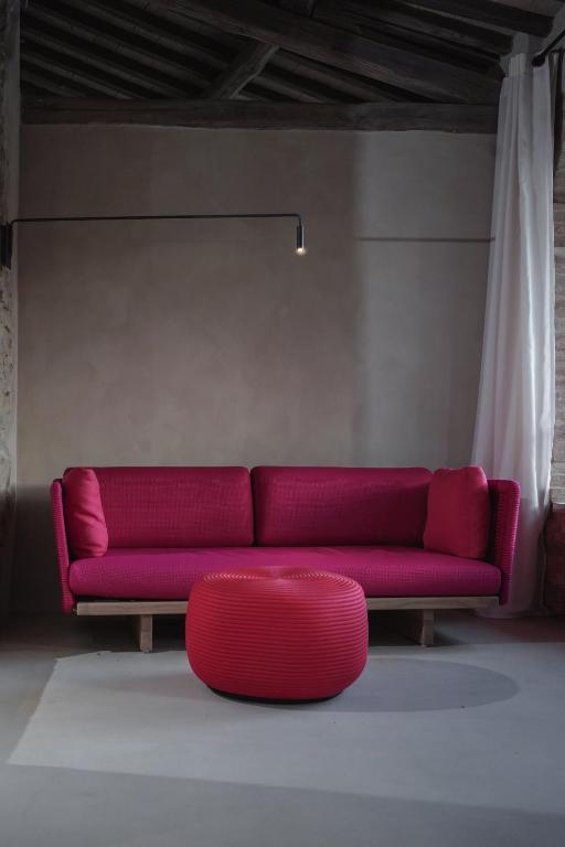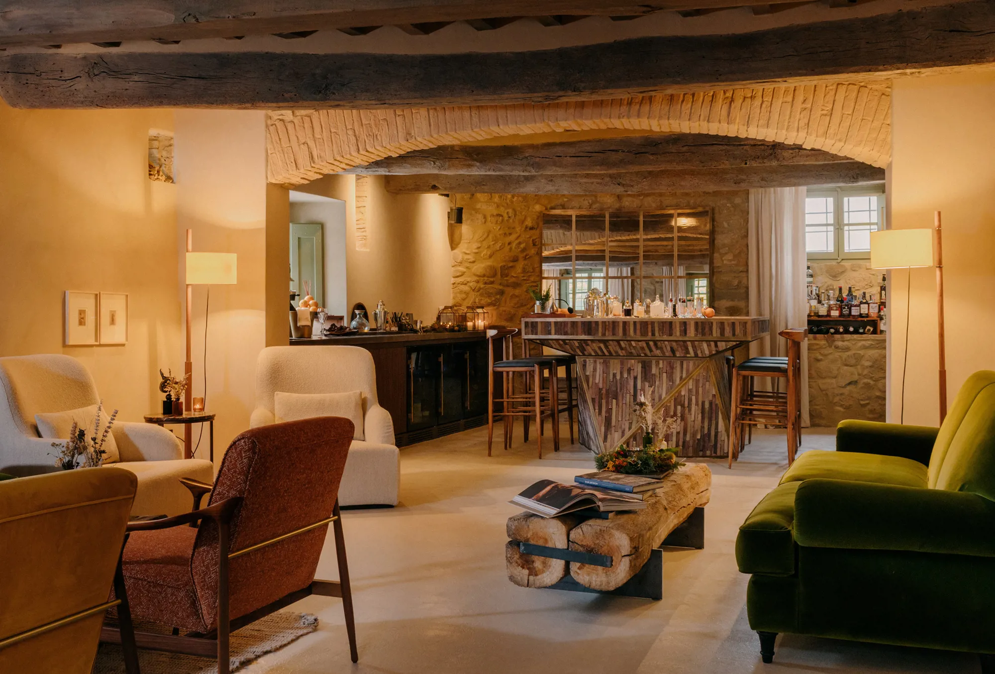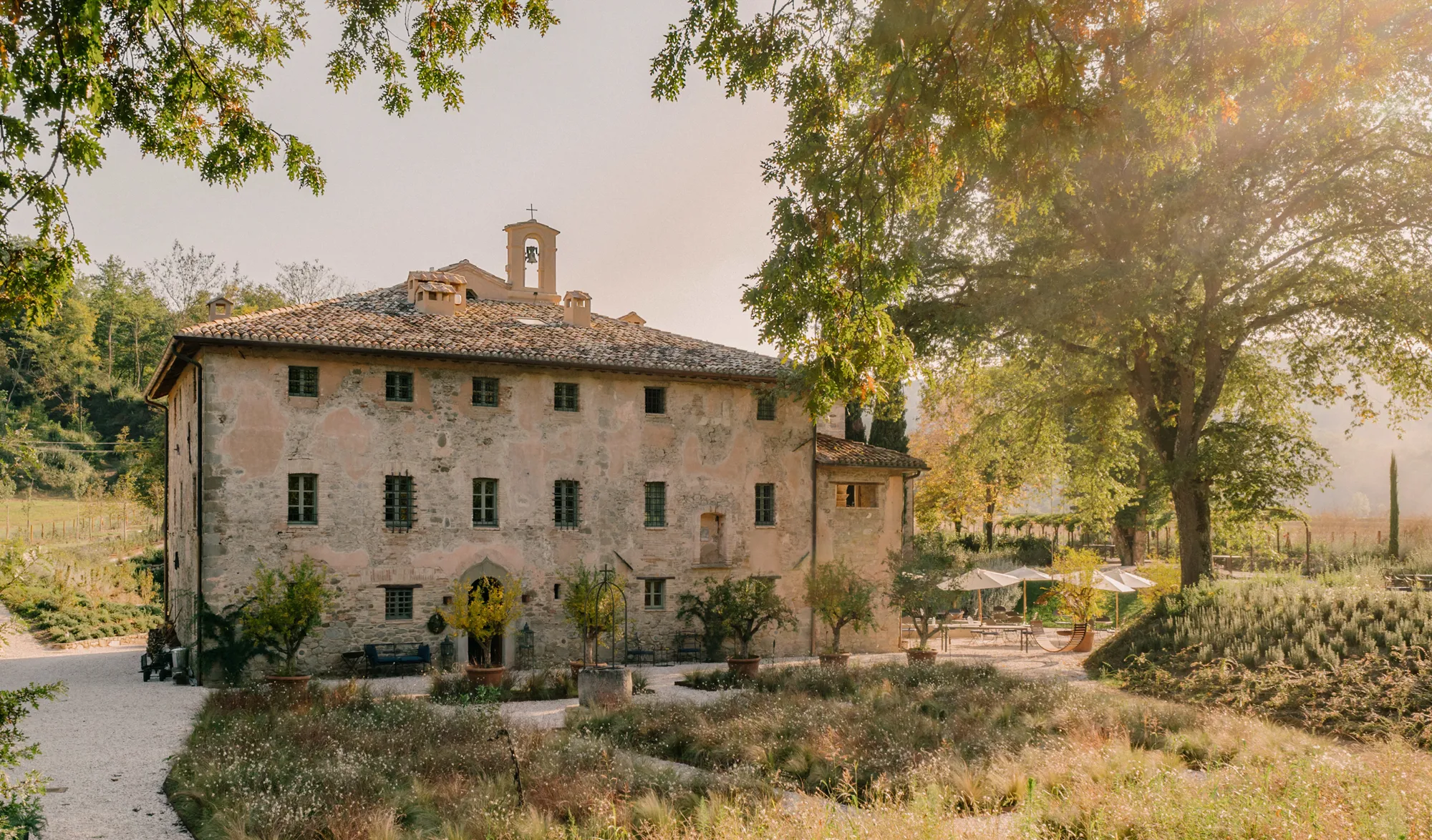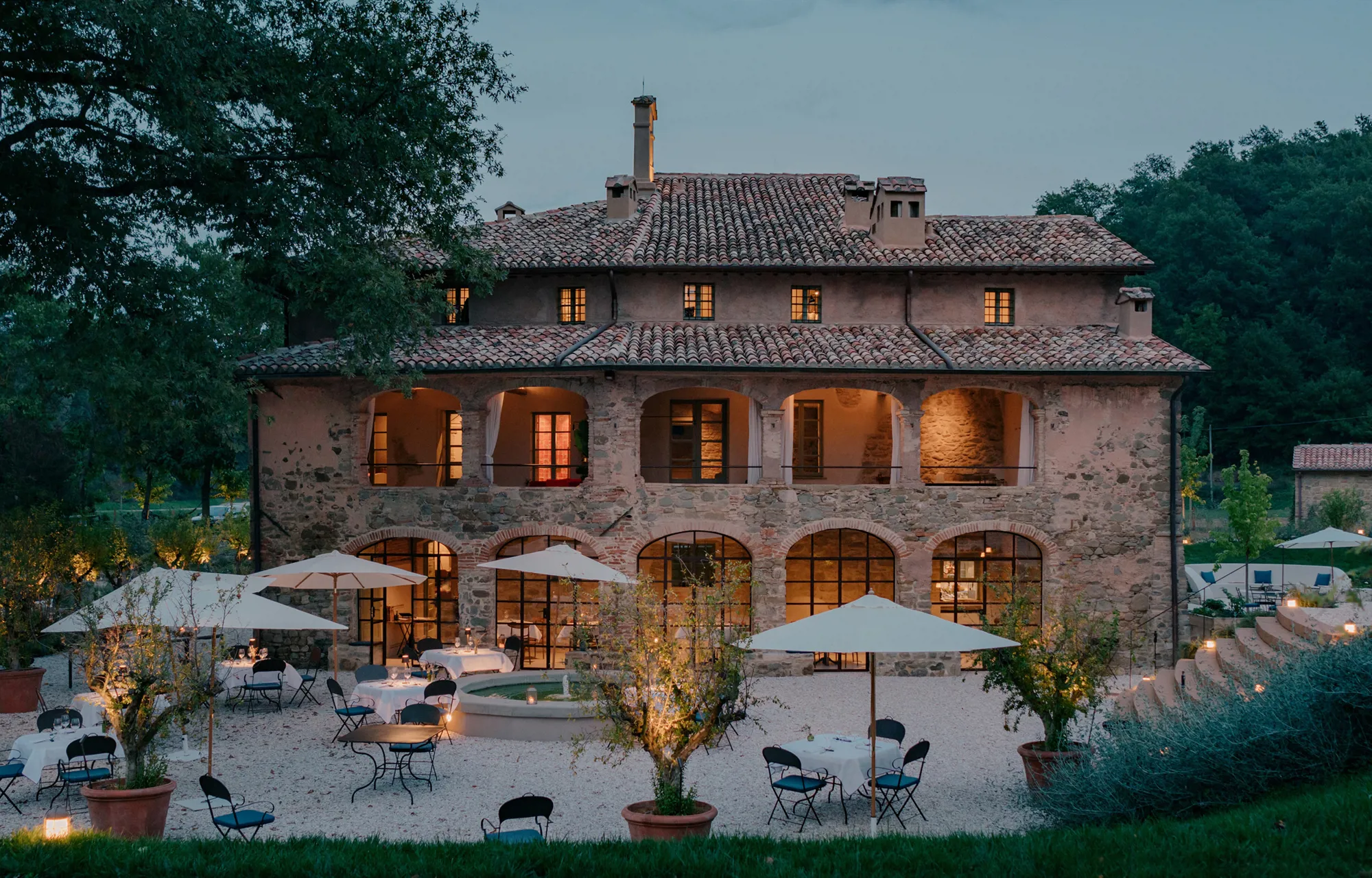 Tucked away in the forests of Perugia, Vocabolo Moscatelli transforms a 12th-century monastery into an intimate 12-room hideaway. Its ancient stone walls and original wooden lintels whisper of centuries past, while interiors embrace a soft, contemporary palette of muted tones and natural materials—unexpectedly punctuated by bold surprises, like a hot pink sofa in an otherwise serene lounge.