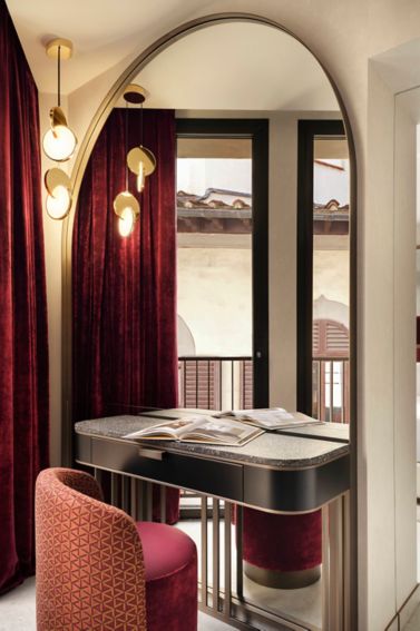 Inside, the hotel hums with energy. The interiors draw inspiration from Florence’s fashion houses and design heritage—lacquered woods, metallic accents, geometric forms, and a vibrant palette of Medici red, royal blue, and rich green. The lobby features a showstopping mural by Adam Ellis Studio, a surreal Florentine garden with nods to the Medici menagerie, while mirror-paneled walls, boucle banquettes, and curved velvet seating evoke a sense of playful grandeur. Every space is a bold mix of luxury and irreverence, where tradition and modernity collide with style.