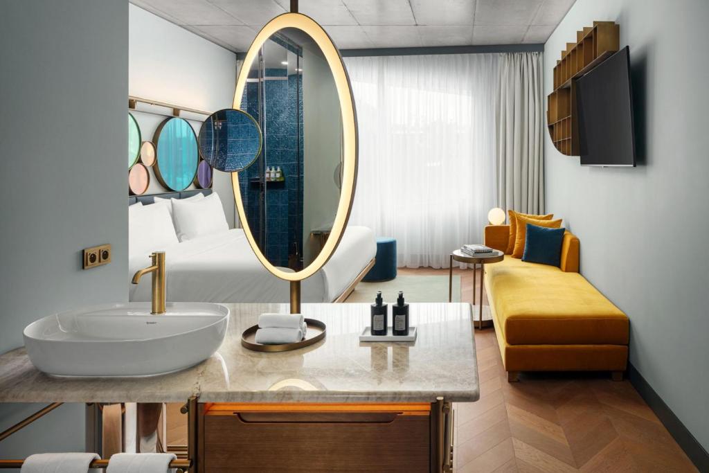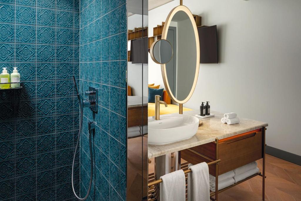 The transformation was entrusted to a powerhouse team of studios—Benoy, AvroKO, Chapman Taylor, and Dam—who approached the project with both respect and daring. The original Art Nouveau façade, adorned with stucco flourishes in shades of yellow, terracotta, and green, has been lovingly preserved, ensuring the hotel retains its historic gravitas. Yet rising behind it is something altogether new: a dramatic nine-story elliptical wing, curving with contemporary bravado. This striking addition doesn’t overshadow the original—it plays off it, a bold architectural duet that anchors the hotel firmly in Prague’s present.