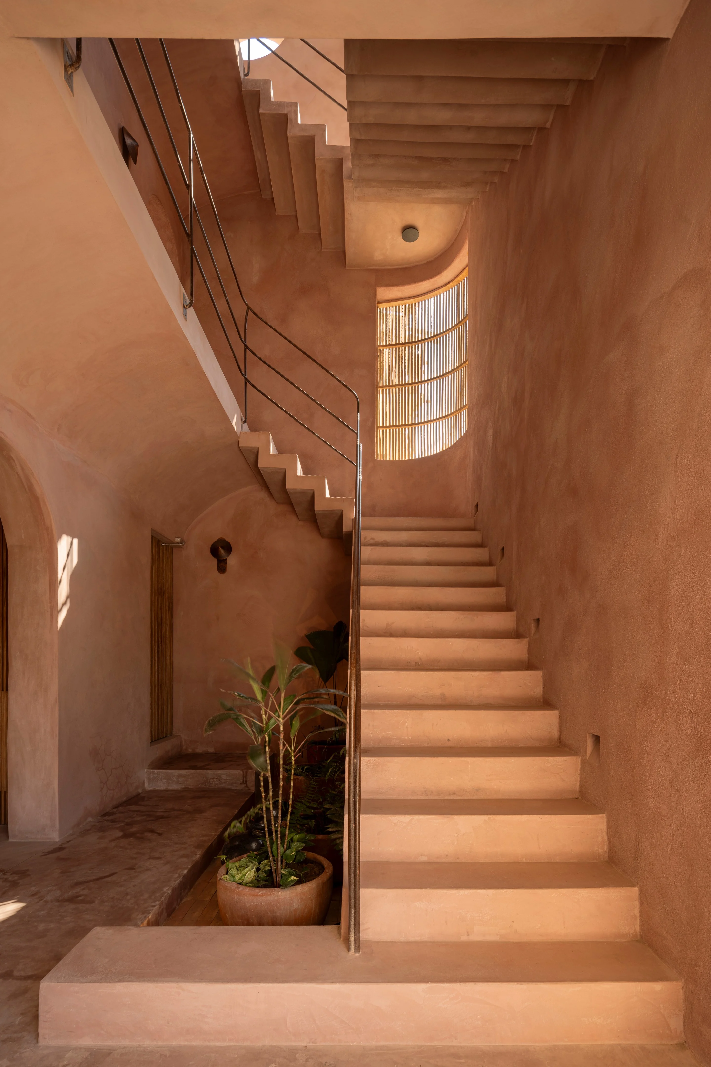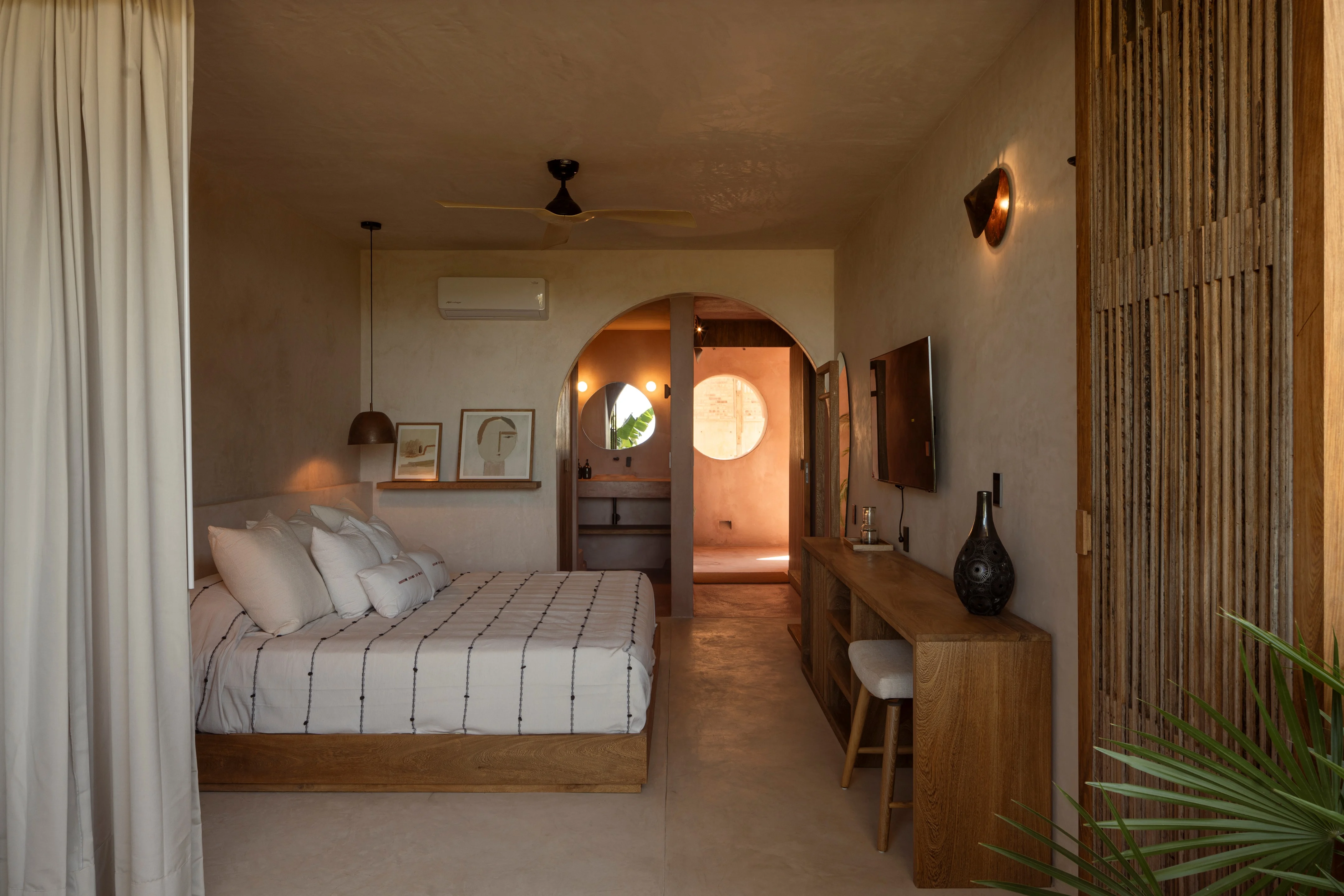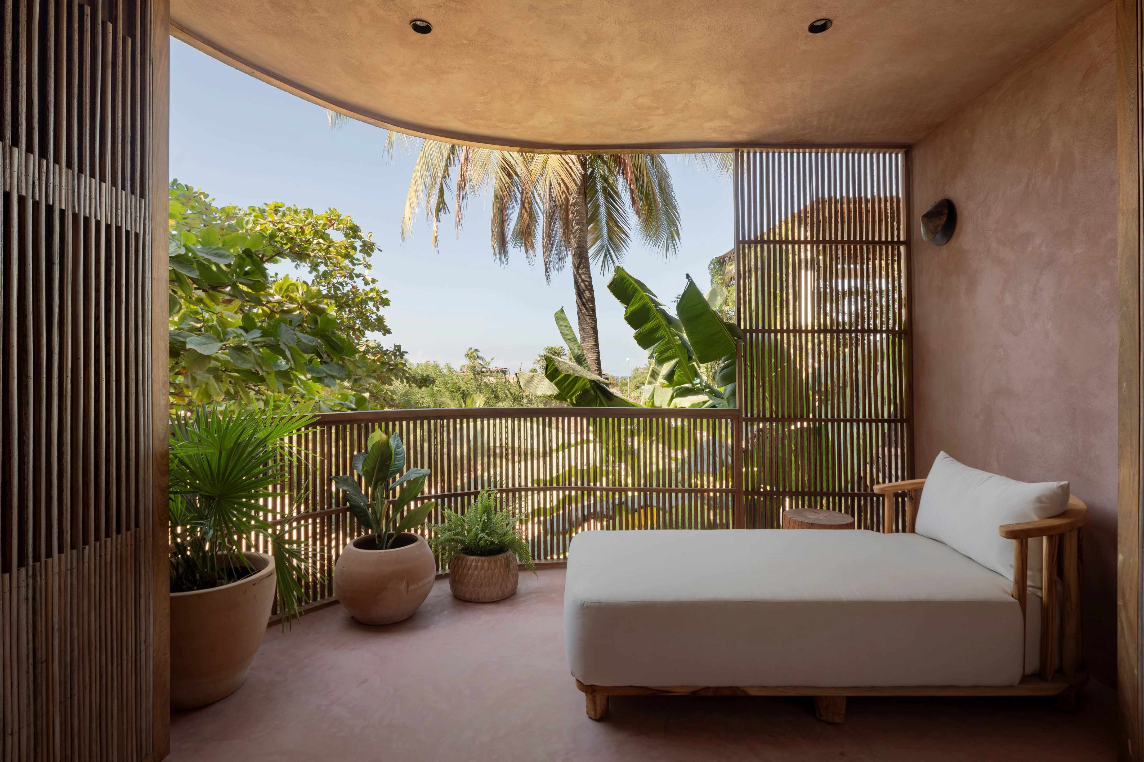 Xiqué’s design leans into clean geometric volumes softened by texture. Concrete walls are punctuated by open voids and archways, inviting in breeze and shadow play. Natural stone, locally crafted wood, and handwoven textiles layer warmth onto the rawness, grounding the hotel firmly in its Oaxacan context. The result is a tropical modernist language that is both striking and serene.