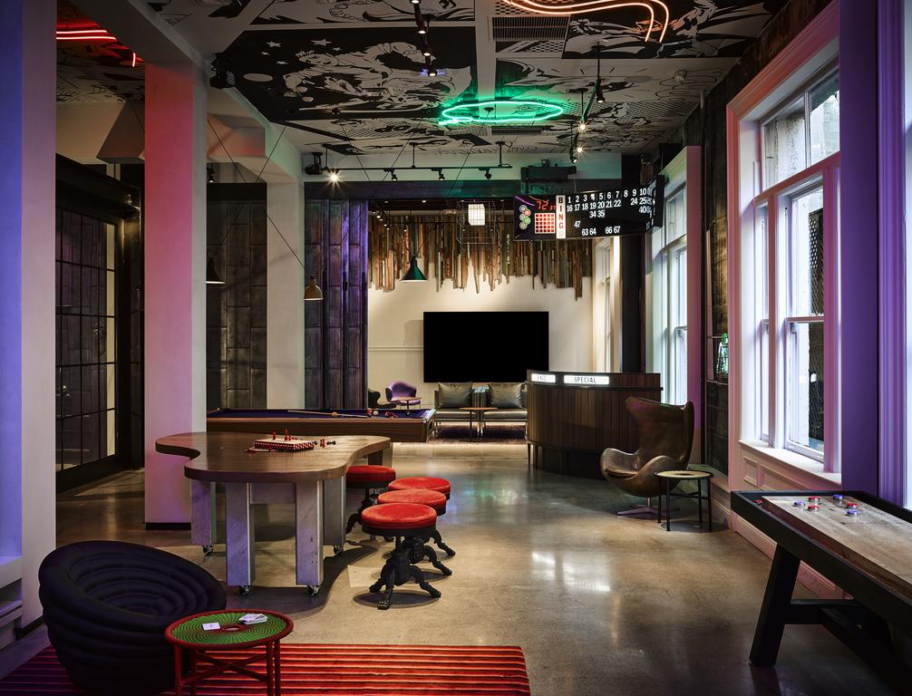 Rooms keep the energy — but balance it with comfort. Plush bedding, oversized screens, metal accents, psychedelic wink-details — everything dark and moody but fully wired. Charging is easy, streaming is easy, working is easy. If you want to sit in a leather chair all night playing Bowie at medium volume — this is exactly that kind of room.